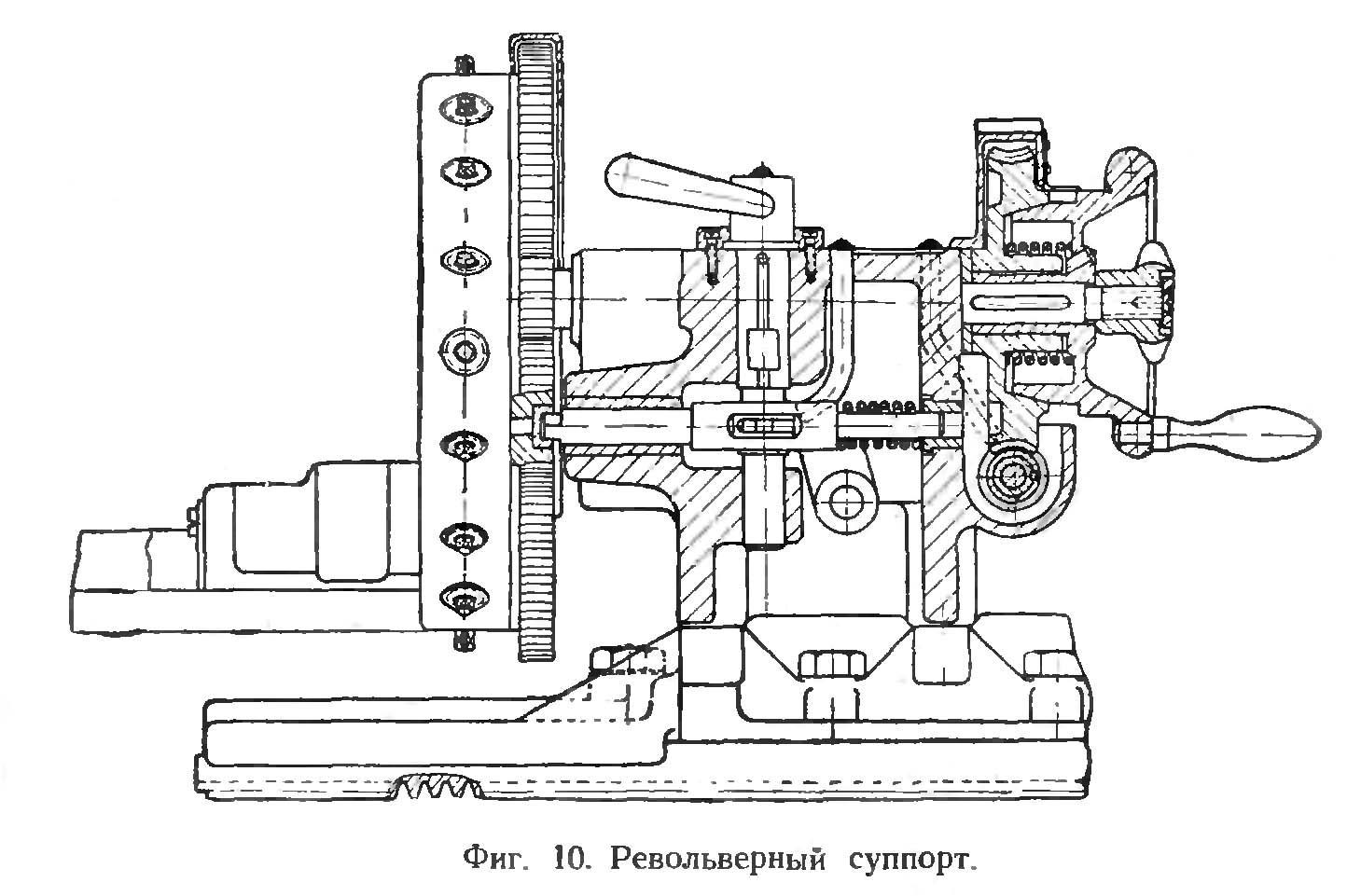 Вращение револьверної головки производится как от руки, при помощи маховичка 9, так і механически.