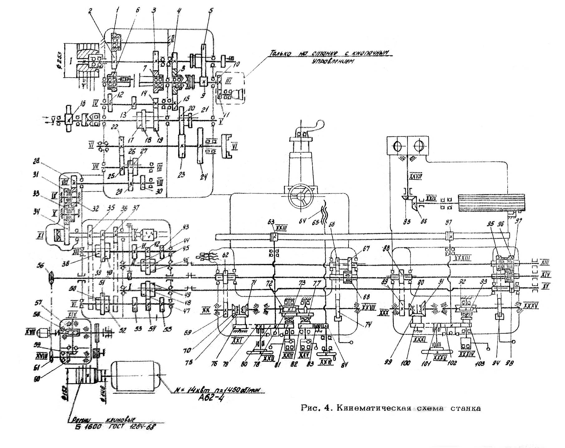 Токарний верстат из СССР имеет преселективное керування изменением швидкостей шпинделя і величин подач. Переключення кулачковых муфт і перемещение скользящих блоков зубчатых колес производятся гідроцилиндрами при медленном вращении валов коробок швидкостей і подач от специальных механізмов.