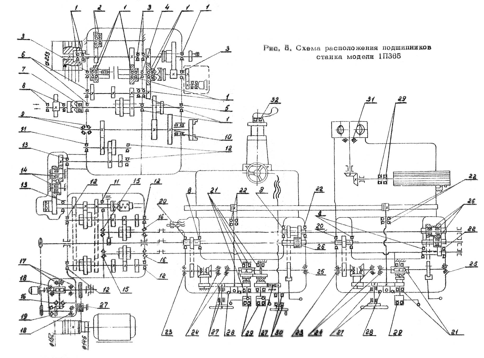 Розташування підшибників токарно-револьверного верстата 1365. Дивитись у збільшеному масштабі