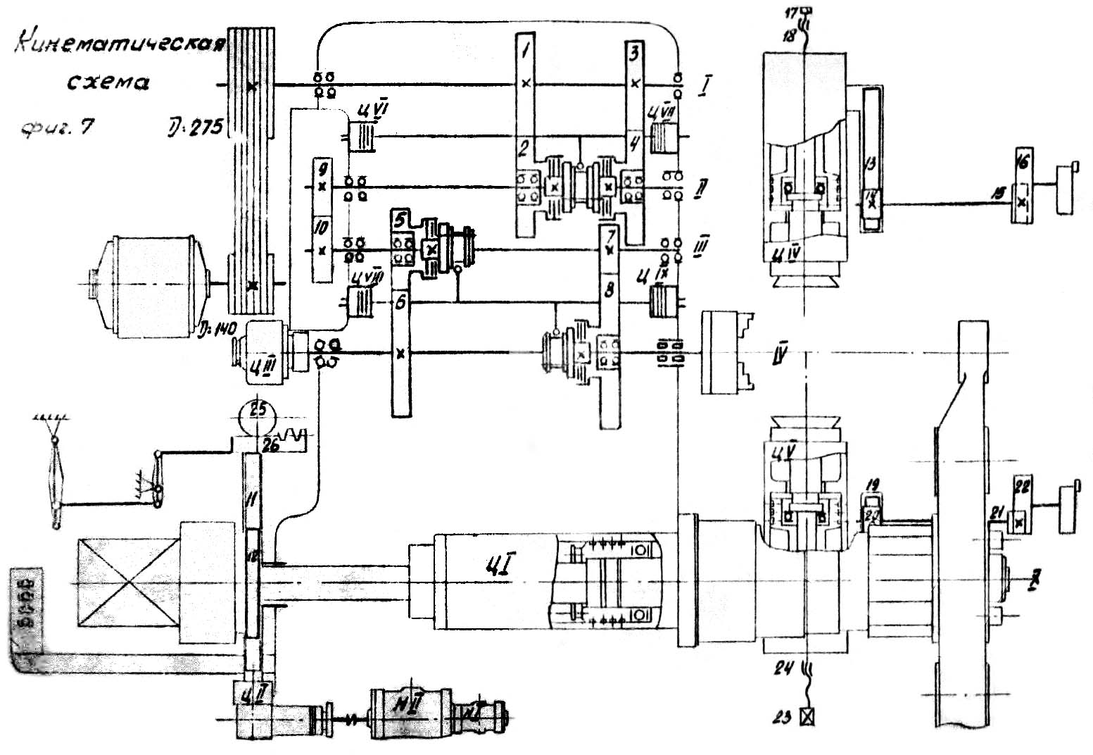 Кінематична схема токарно-револьверного верстата 1425. Дивитись у збільшеному масштабі