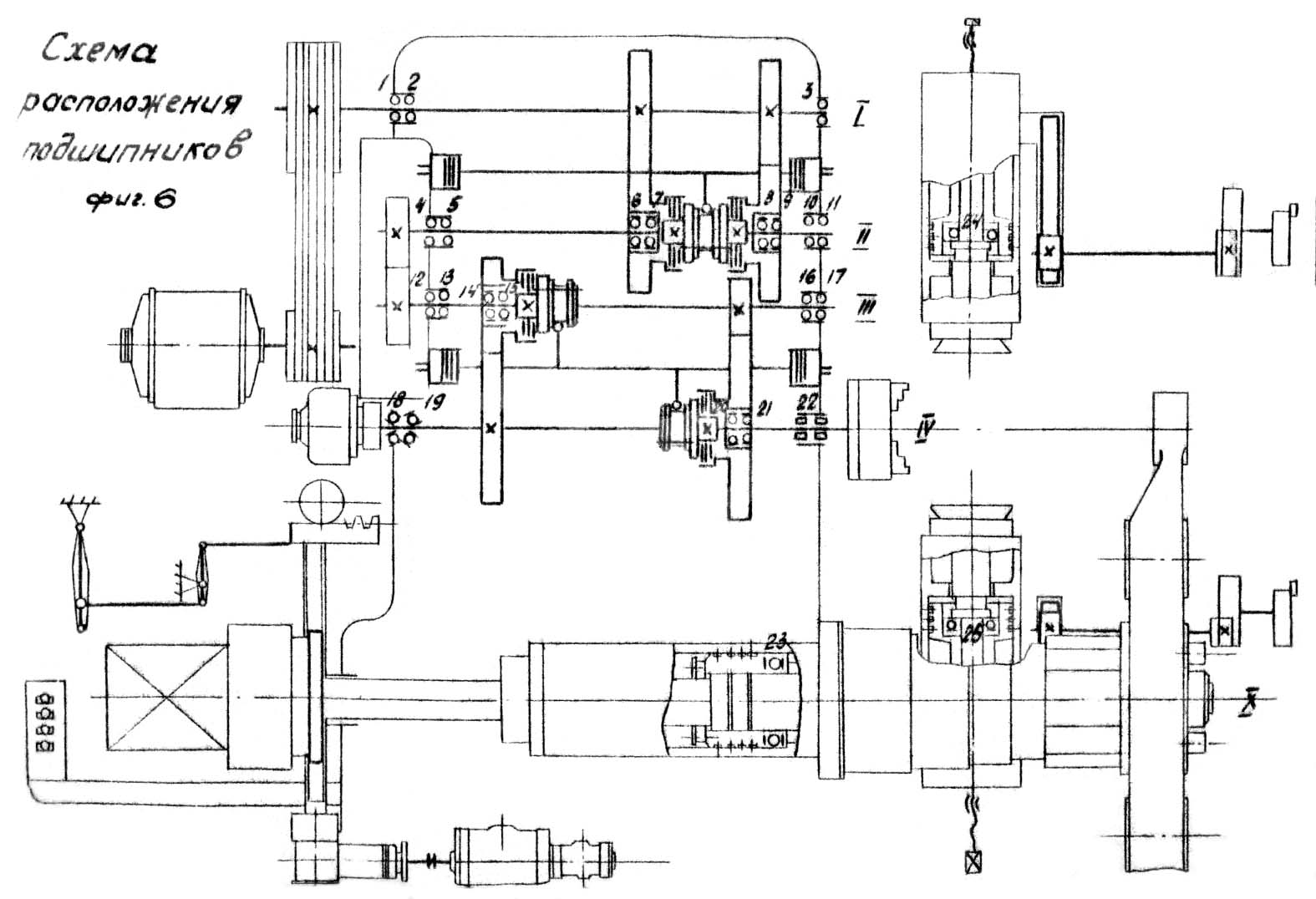 Схема розташування підшипників токарно-револьверного верстата 1425. Дивитись у збільшеному масштабі