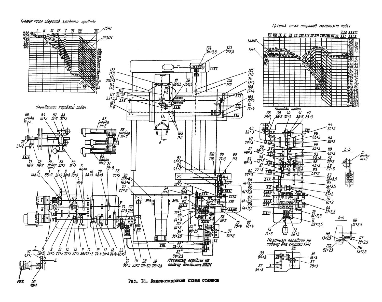 Кінематичні схеми токарно-карусельних верстатів 1541 і 1531М подібні між собою і відрізняються одна від одної лише кінематикою ланцюга механізму передачі руху на подачу та числом зубців зубчастиних коліс стола.
