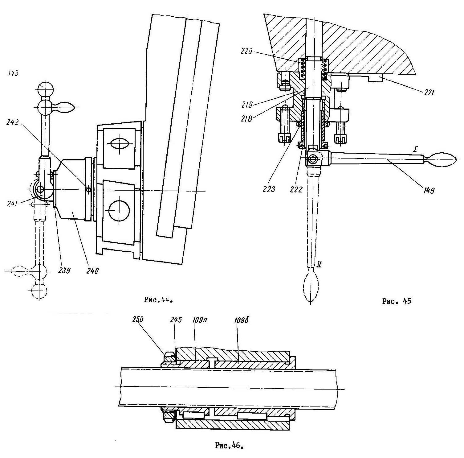 Необхідність у регулюванні затискача різцевої головки (див. рис. 45) виникає внаслідок зносу ексцентрика рукоятки 149 і опорної поверхні втулки 222. Регулювання здійснюється різьбовою втулкою 222, що стопориться контргайкою 223.