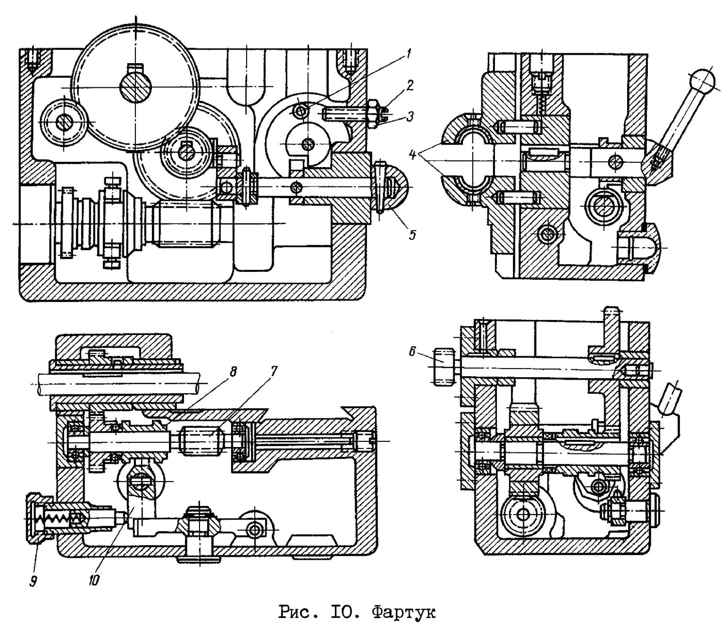 Фартух повідомляє супорту поздовжнє переміщення. При нарізанні різьблення рух передається ходовим гвинтом і матковою гайкою 4 (рис. 10), а при проточці - рейковою передачею 6. Обертання рейкової шестерні від ходового ггвинта передається перевантажувальним механізмом 10 і проміжними шестернями.