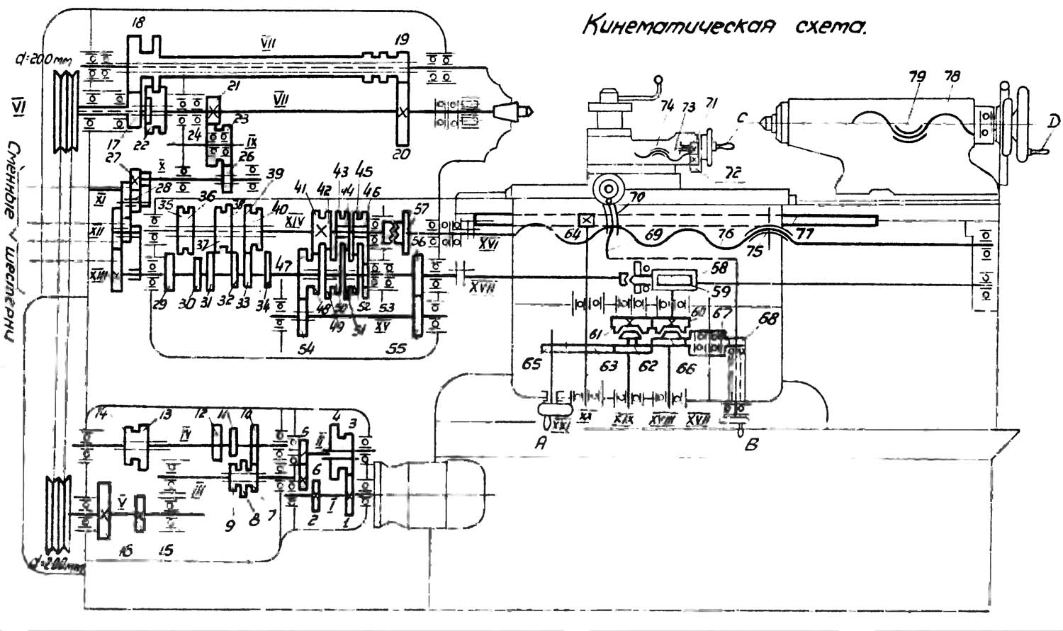 1. Схема кінематична токарно-гвинторізного верстата 1616. Дивитись у збільшеному масштабі