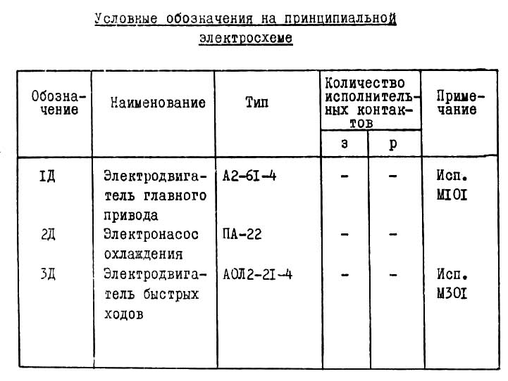 Пуск головного електродвигуна осуществляется нажатием одной из кнопок "Пуск" - 1КУ, 2КУ (расположенных на фартуке і около коробки подач), которая замыкает день живлення катушек магнитного пускателя КШ і реле часу IPB (4-13). . Катушки под влиянием проходящего по ним тока притягивают сердечники якорей і замыкают механически связанные з ними главные контакты і блок-контакты. При етом главные контакты КШ подключают електродвигатель 1Д к сети, а катушки пускателя і реле часу питаются через замкнувшийся блок-контакт КШ (1-5), что исключает дальнейшее нажатие кнопки "Пуск".