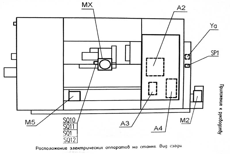 Розташування елементів, находящихся непосредственно на станке. показано на табличках, закрепленных на дверце шкафа електроавтоматики.