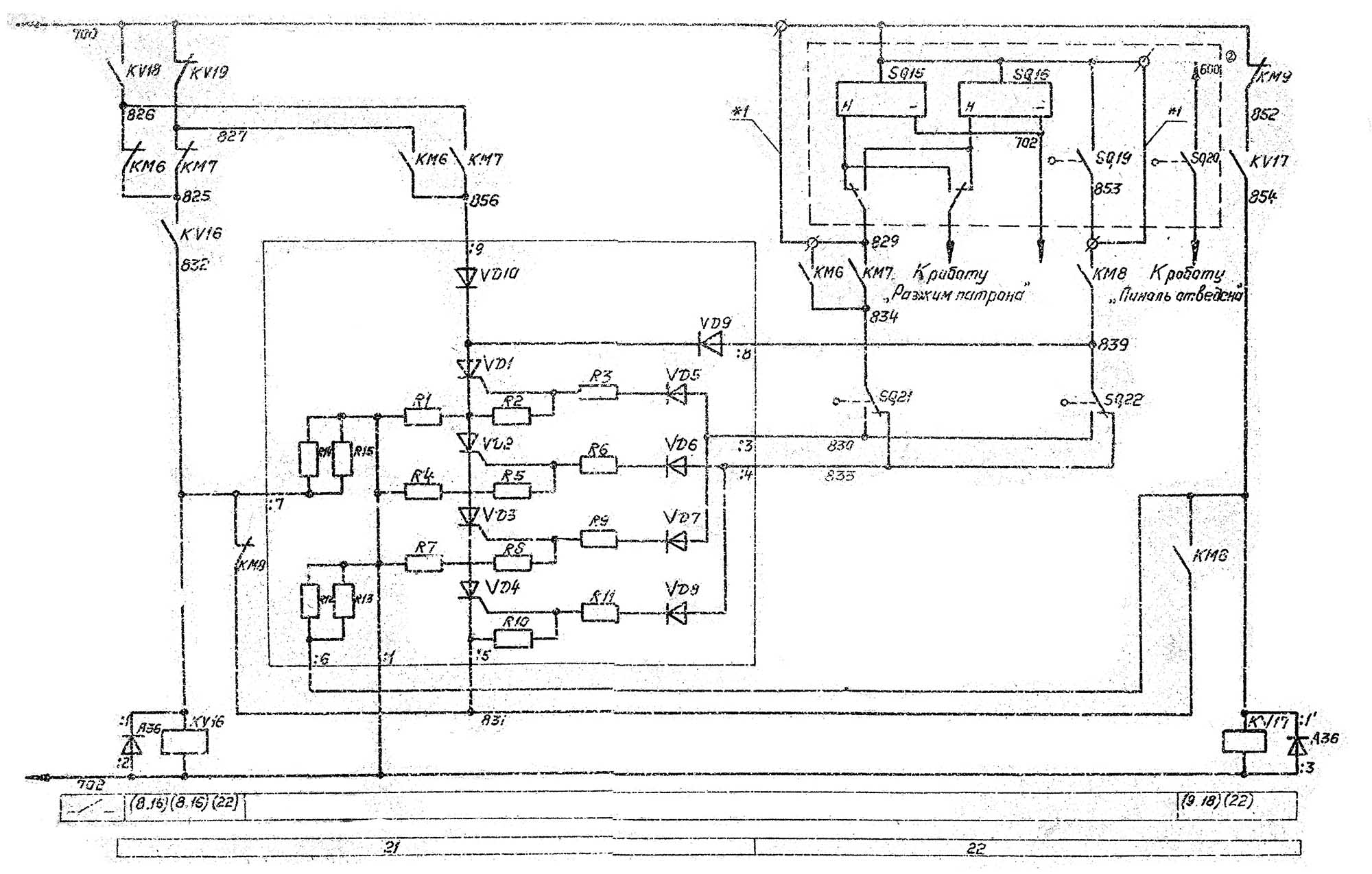 Для увімкнення соответствующей скорости шпинделя сигналы подаются на кодовые реле скорости. Соединение контактов кодовых реле представляет собой релейный дешифратор, на выходе которого, при соответствующем включении кодовых реле, получаем одну из девяти необходимых швидкостей шпинделя, з включением соответствующей електромагнитной муфты АКС (порядок увімкнення електромагнітних муфт указаны в таблице на принципиальной електросхеме верстата).