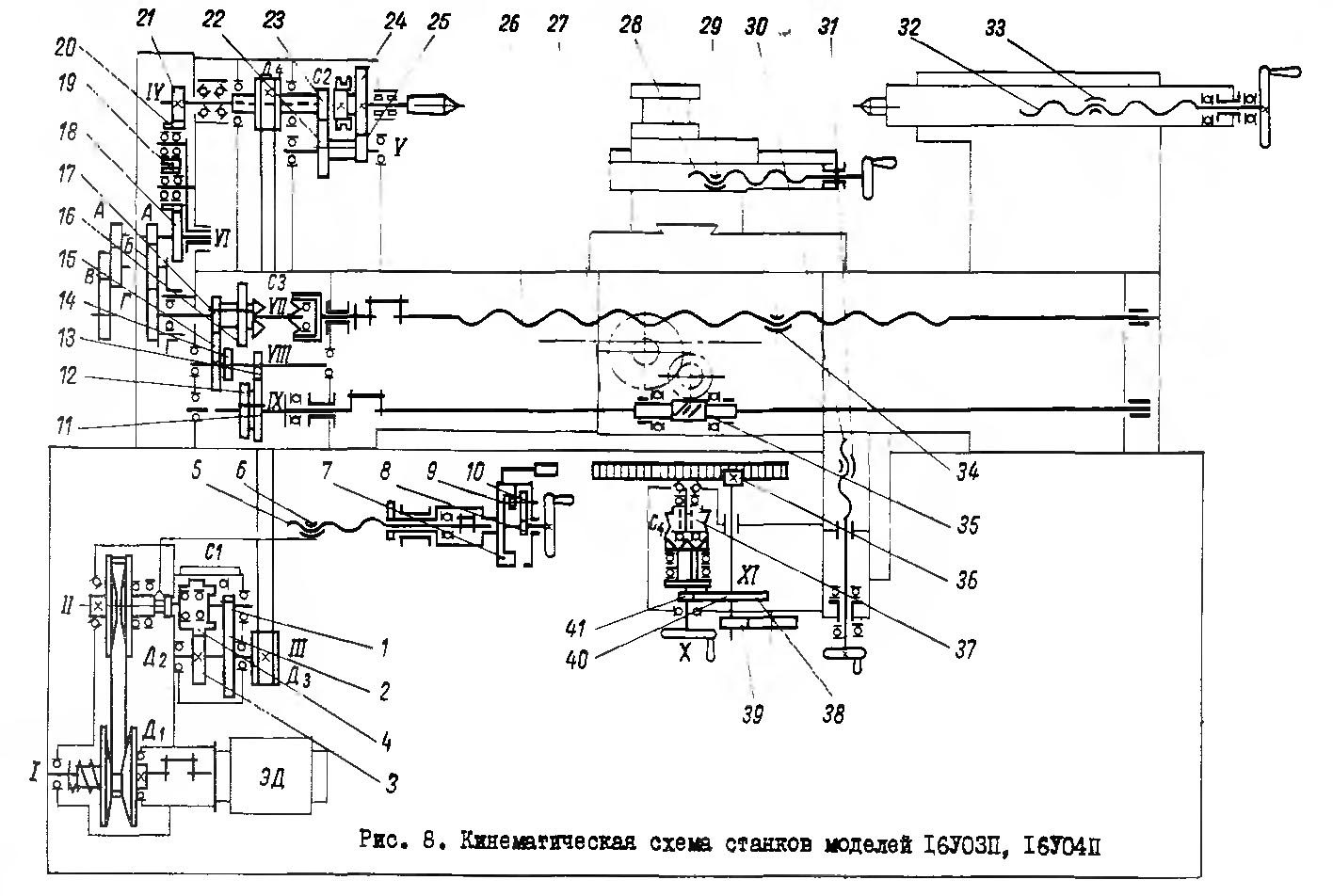 Схема кінематична токарно-гвинторізного верстата 16У03п. Дивитись у збільшеному масштабі