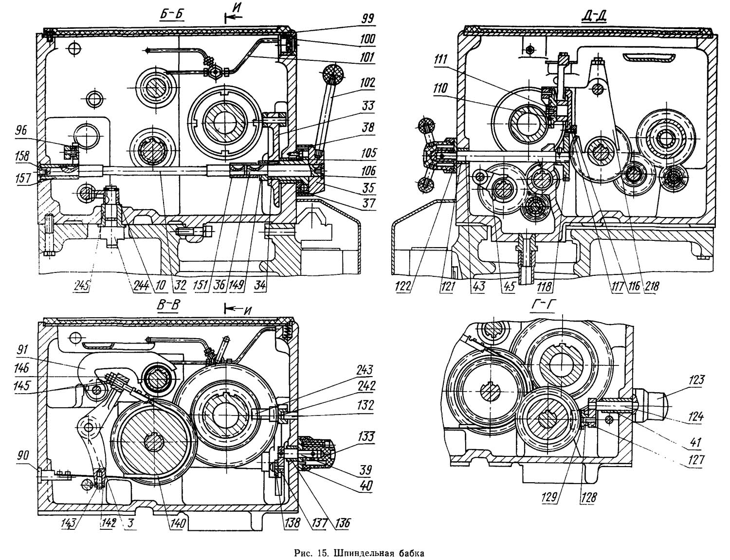 Шпиндельная бабка токарно-гвинторізного верстата 16вт20п. Разрез Б-Б, В-В, Г-Г, Д-Д