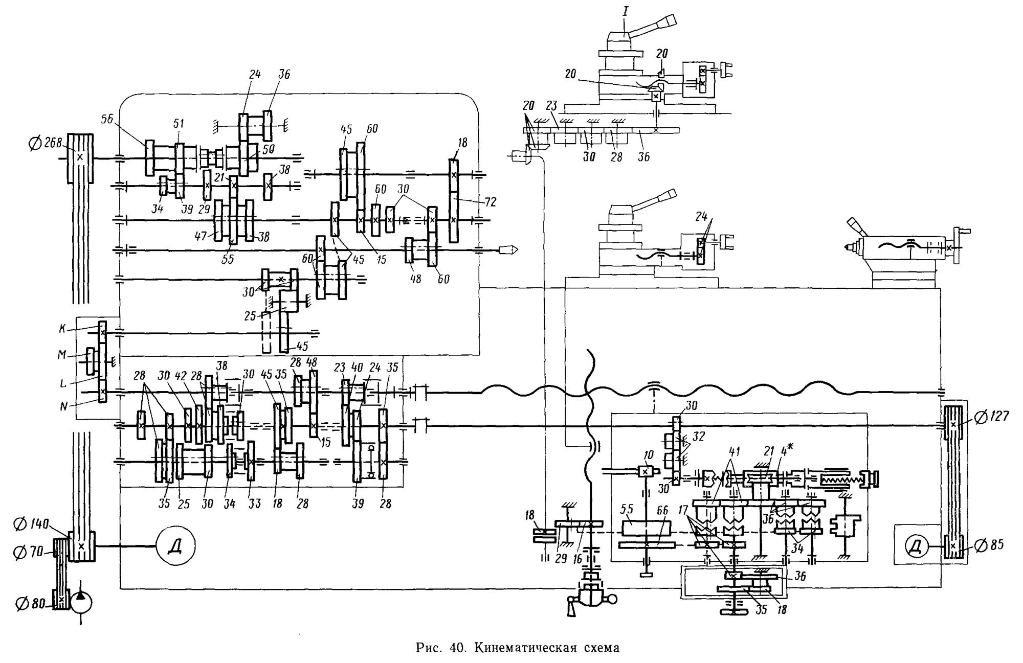 Кінематична схема приведена для понимания связей і взаимодействия основних елементів верстата. На выносках проставлены числа зубьев (г) шестерен (звездочкой обозначено число заходов червяка).