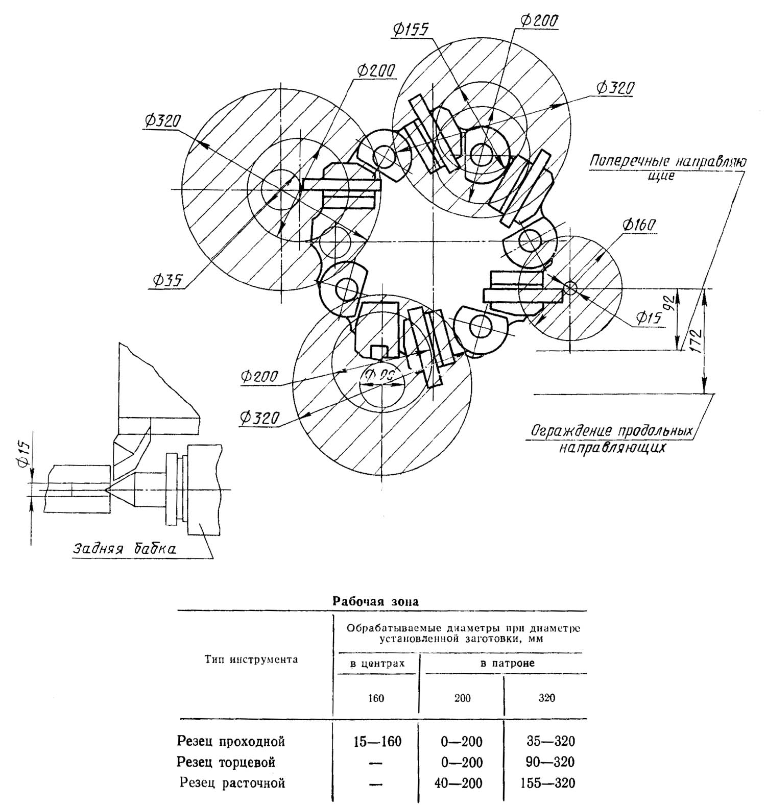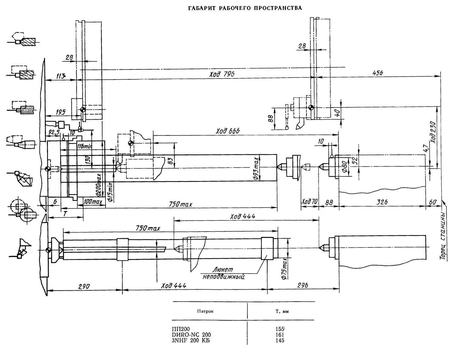 Габаритні розміри робочого простору токарного верстата 1716ПФ3. Дивитись у збільшеному масштабі