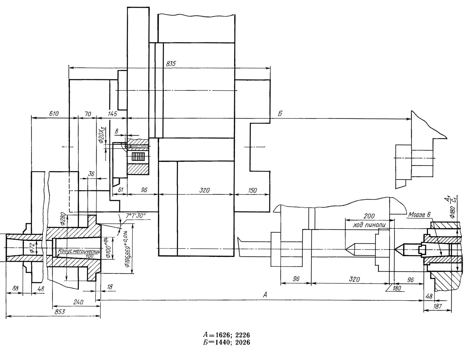 Наибольший ход пиноли задньої бабки, мм | 200 | |
