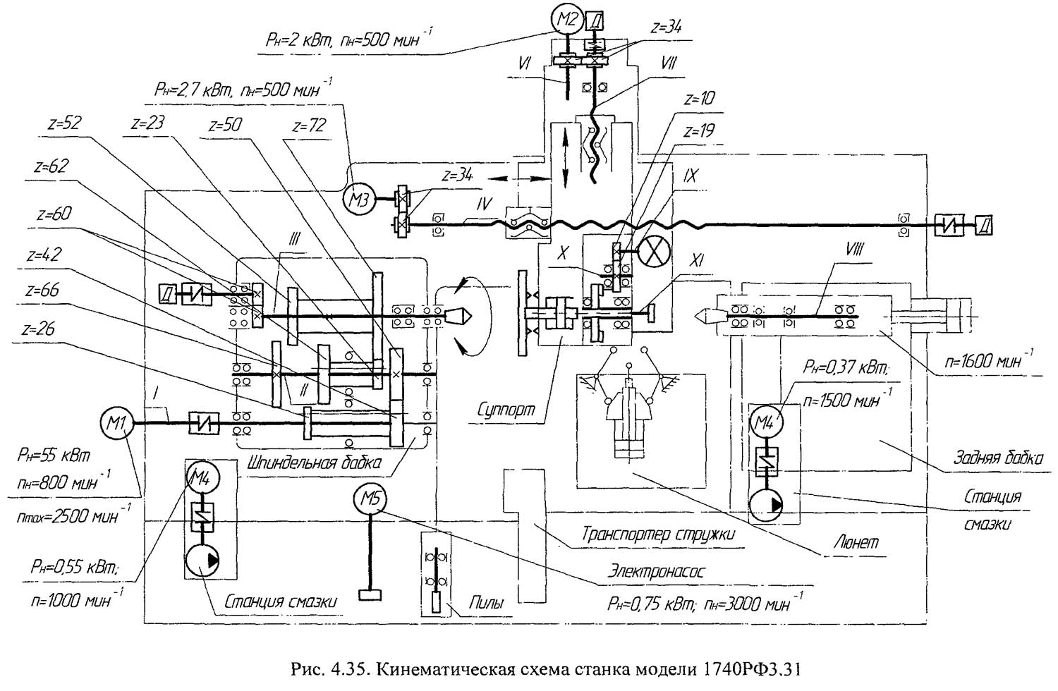 Схема кінематична токарного верстата 1740РФ3. Дивитись у збільшеному масштабі