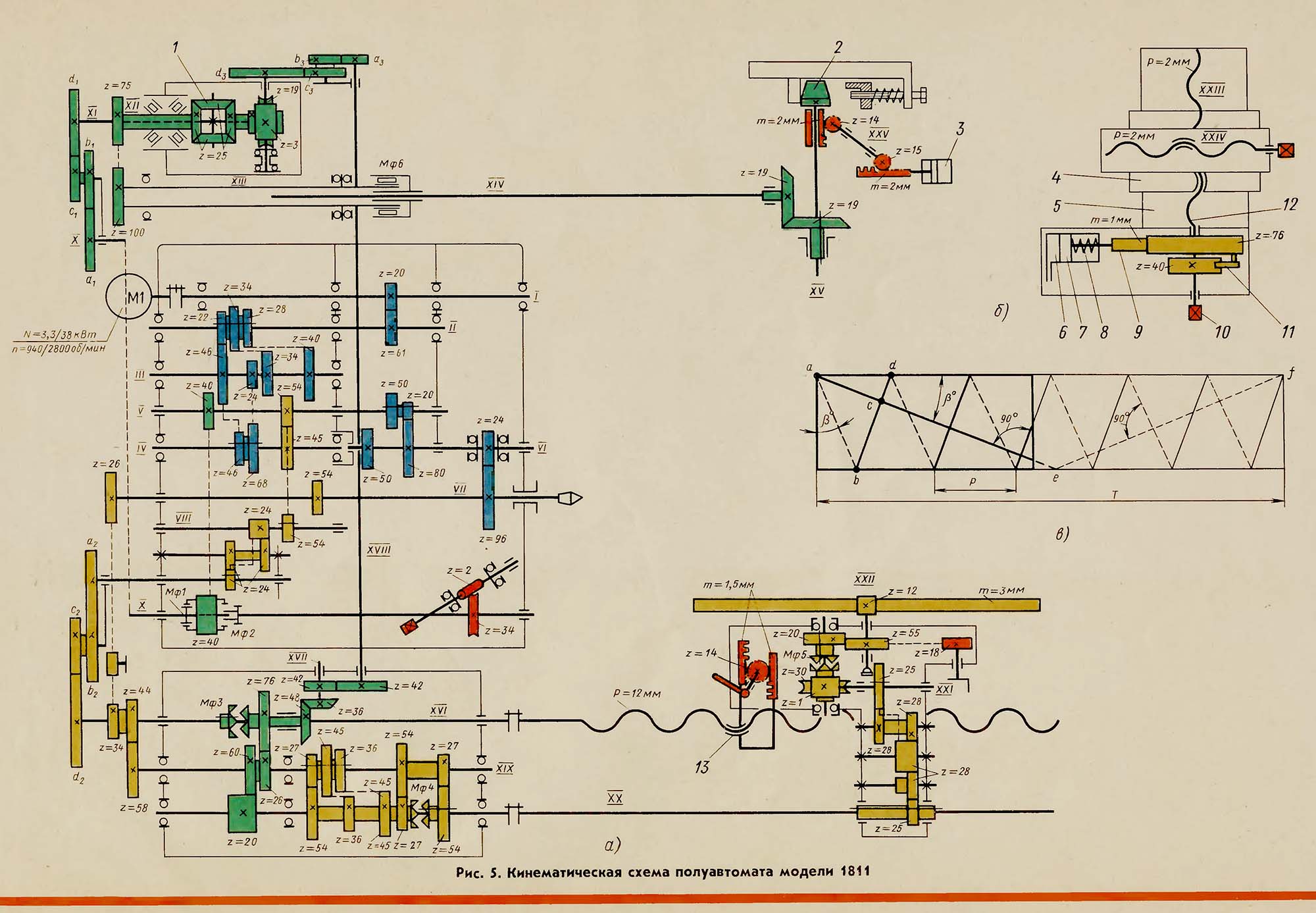 Обертання кулачку 2 (рис. 5, а) передається від шпинделя VII на вал V через зубчасті колеса перебору з передавальним відношенням uпер, далі на вал X через зубчасті колеса 40/40 і на вал XI через змінні зубчасті колеса a1/b1 • c1/ d1 – гітари поділу.