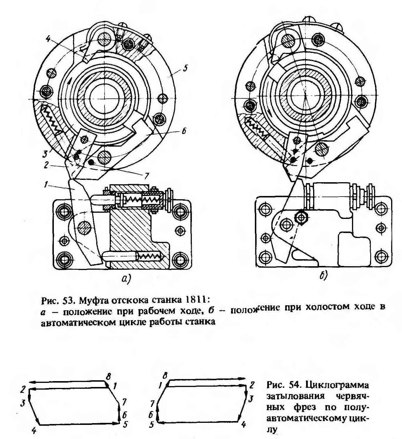 При ручному циклі роботи, коли точний зупинка кулачка потиличних не потрібен, собачку 6 муфти відскоку необхідно вивести з паза кулачка 3 і закріпити гвинтом 7 у неробочому положенні.