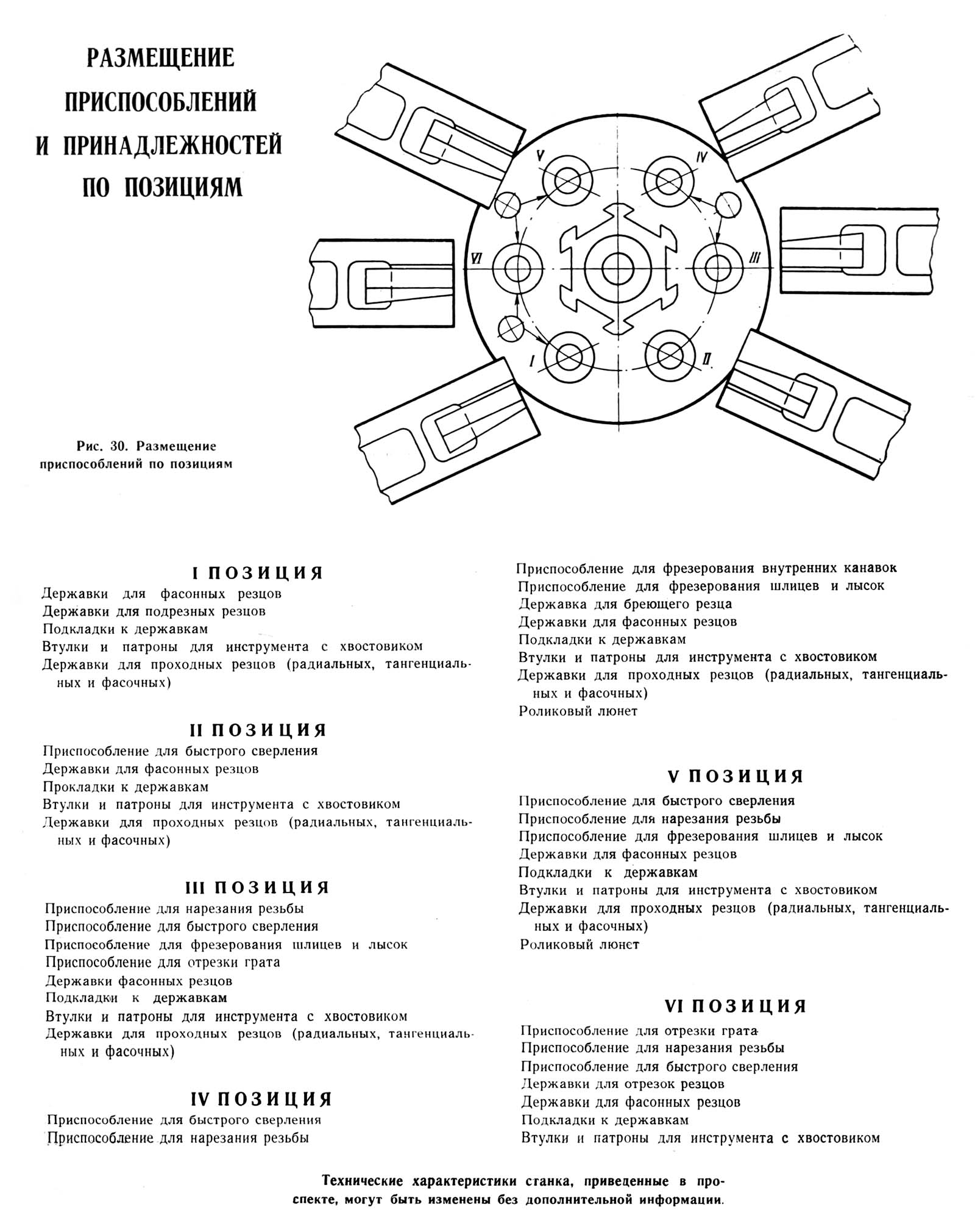 Кожна позиція обслуговується поперечним і поздовжнім супортами, а останні чотири позиції додатковими пристроями з незалежною від інших супортів та пристроїв подачею. Крім того, у п'яти позиціях (II, III, IV, V, VI) можуть встановлюватися інструментальні шпинделі, що обертають інструмент (свердла, розгортки, мітчики тощо) з незалежною від робочих шпинделів швидкістю, що дає можливість застосовувати різні пристрої, що вимагають зміни швидкості різання.