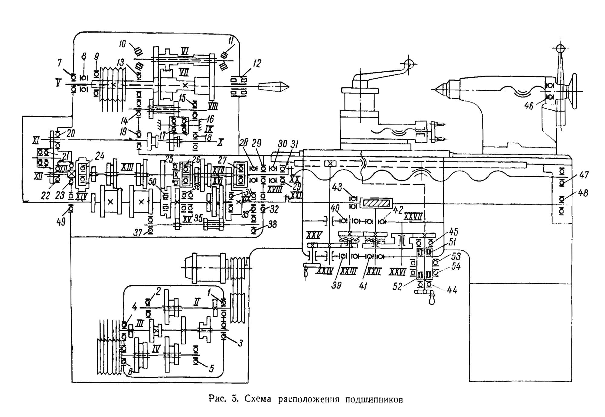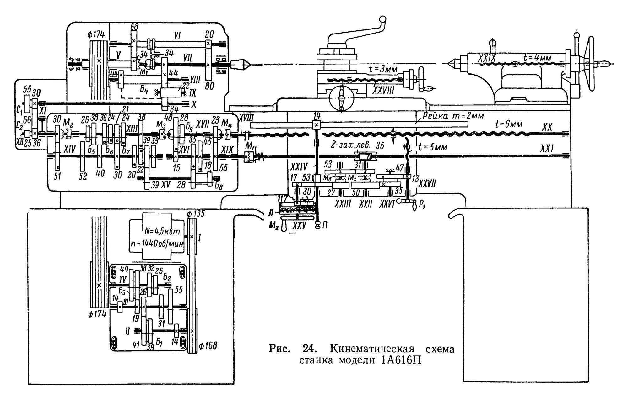 Когда нарезаются дюймовые і питчевые різьби (как показано на схеме), кулачковая муфта М2 выключена. Колесо 51 зацеплено з шестерней 30 вала XII, а шестерня 39 на валу XV введена в зацепление з шестерней 39 двойного блока 22—39, свободно сидящего на валу XIV. Для нарізання метрических і модульных різьб включается муфта М2, колесо 51 выводится из зацепления, а шестерня 39 перемещается по валу XV вправо до зацепления з колесом 39, жестко закрепленным на валу XIV Суппорт получает рух от коробки подач через кулачковую муфту М4, промежуточный валик XVIII і ходовой винт XX.