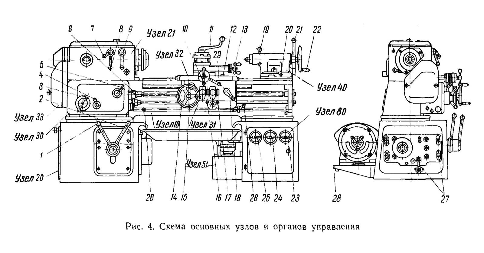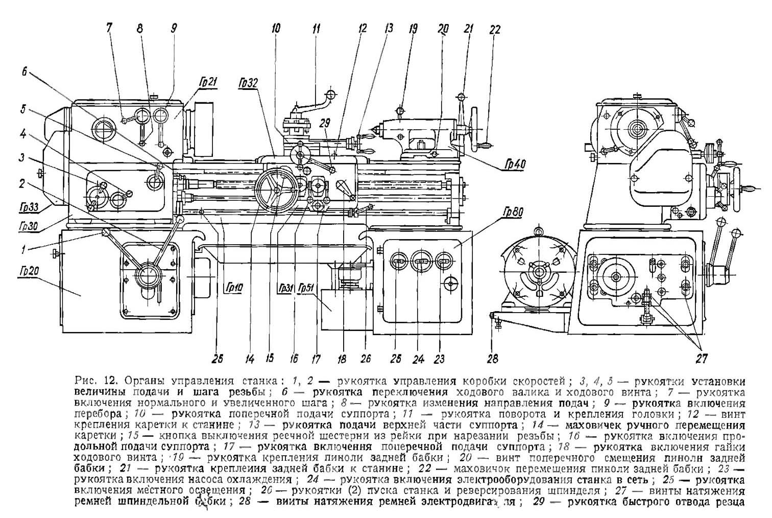 Розташування основних вузлів та органів керування токарним верстатом 1А616П