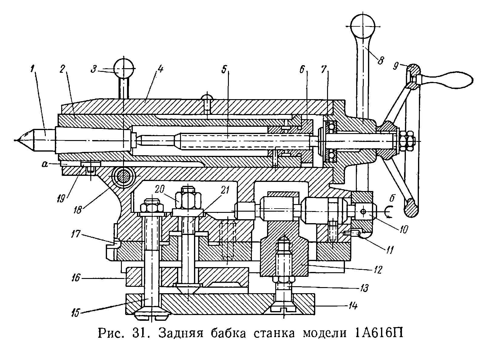 Задня опора шпинделя состоит из радиально-упорного шарикопідшипника 6 серии 46211А і шарикового упорного підшипника 7 серии 8211А. Регулювання задньої опори производится гайкой 2. Шпиндель 18 Верстата моделі 1А616П имеет фланцевый передний конец з коническим центрирующим буртиком, выполненным по ГОСТу 2570—58 і обеспечивающим быстросменность установки патронов і надежность их крепления. Приводной шкив 9 закреплен на полом валу 10, который смонтирован на независимых от шпинделя шарикопідшипниках 8. Такой монтаж приводного пристроя разгружает шпиндель от изгибающих усилий со стороны клиноременной передачи і ведущей шестерни г перебора, изготовленной за одно целое з полым валом 10. Конструкція задньої опори шпинделя позволяет устанавливать і заменять приводные ремни без демонтажу шпинделя. Для етого снимают защитный кожух 3, отворачивают гайку 2, отвинчивают фланец 4 і з помощью отжимных болтов выпрессовывают буксу 5 из корпуса 1 бабки. В образовавшееся отверстие заводят клиновые ремни для их монтажа или смены
