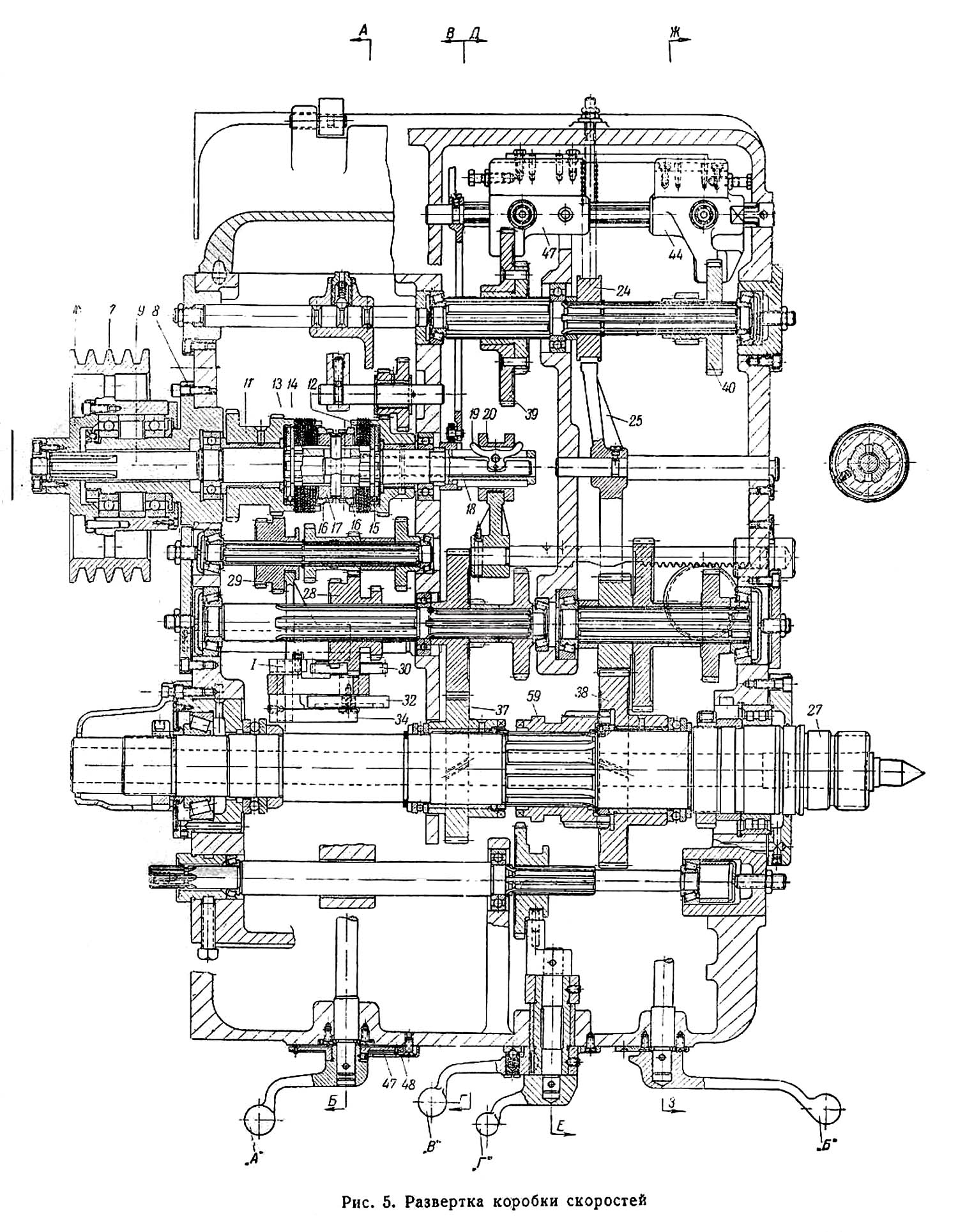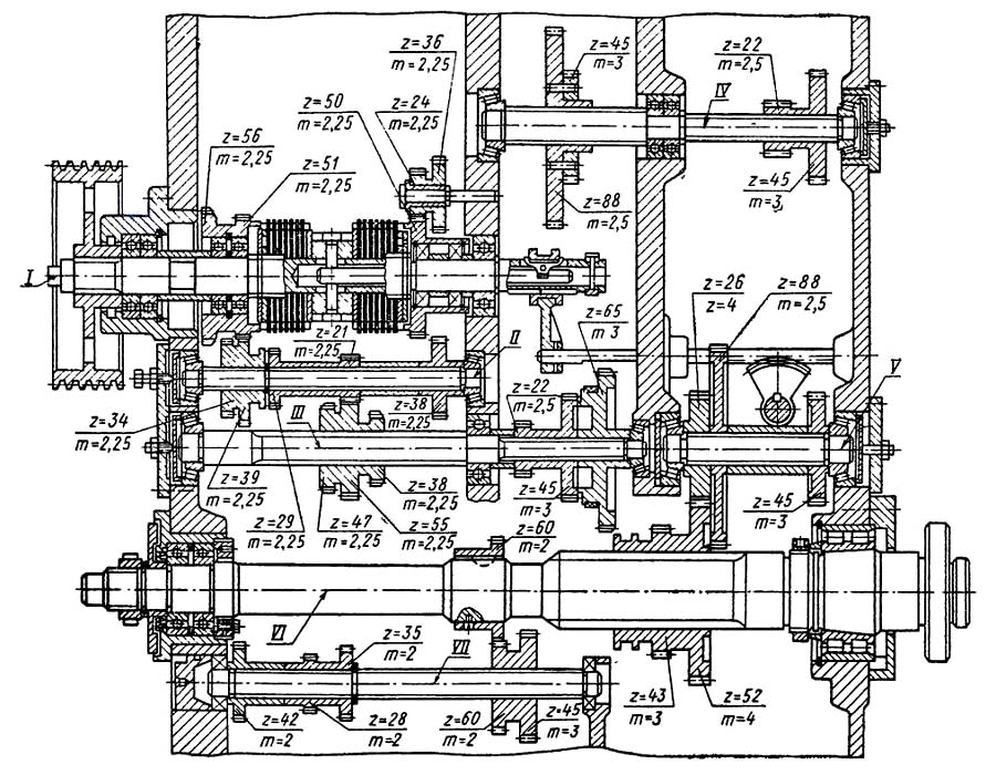 21 различная скорость і 3 перекрывающиеся скорости от 11,5 до 1200 оборотів в минуту при прямом ходе шпинделя осуществляются по следующим кинематическим цепям: от вала 1, имеющего 730 об/мин, вращение передається на вал 11 зубчатыми колесами 1—6 или 2—7. Далее вращение передається валу III переключающимся зубчатым блоком 11—13, соответственно сцепляющимся з зубчатыми колесами 8, 9 і 10. При включенном зубчатом колесе 26 от вала III зубчатыми колесами 14 і 26 вращение сообщается Шпинделю 17. При включенном колесе 24 зубчатыми колесами 15-17 или 16—18 рух передається валу IV, зубчатыми колесами 19-22 или 20—21 — валу V і постоянно сцепленными зубчатыми колесами 23—24 — шпинделю VI.