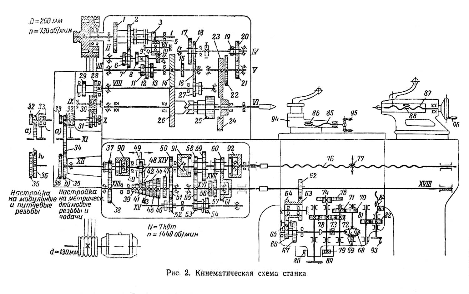 Для нарізання точных різьб ходовой винт 76 може соединяться напрямую з валом сменных зубчатых колес XII муфтами 90, 91 і 92.