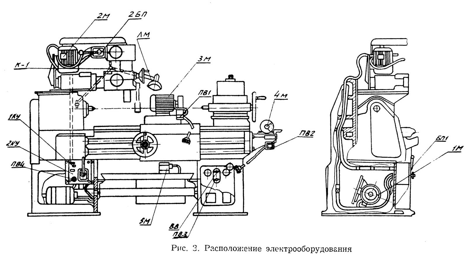 Електроустаткування верстата (рис. 3, 4, 5) рассчитано на напряжение 380 или 220 вольт трехфазного переменного тока (В зависимости от заказа) і состоит из 5 електродвигателей з короткозамкнутым ротором, пульта керування з кнопками, переключателя електродвигуна 1М, переключателей електродвигуна 2М, выключателей електродвигателей 3М, 4М, 5М і панелі з аппаратурой, размещенной в правой тумбе верстата.