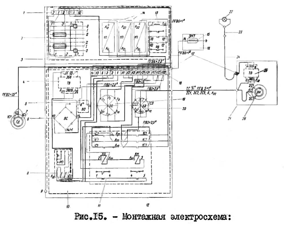 Монтажная схема показана на рис.15. Розташування електрических аппаратов на рис.16.
