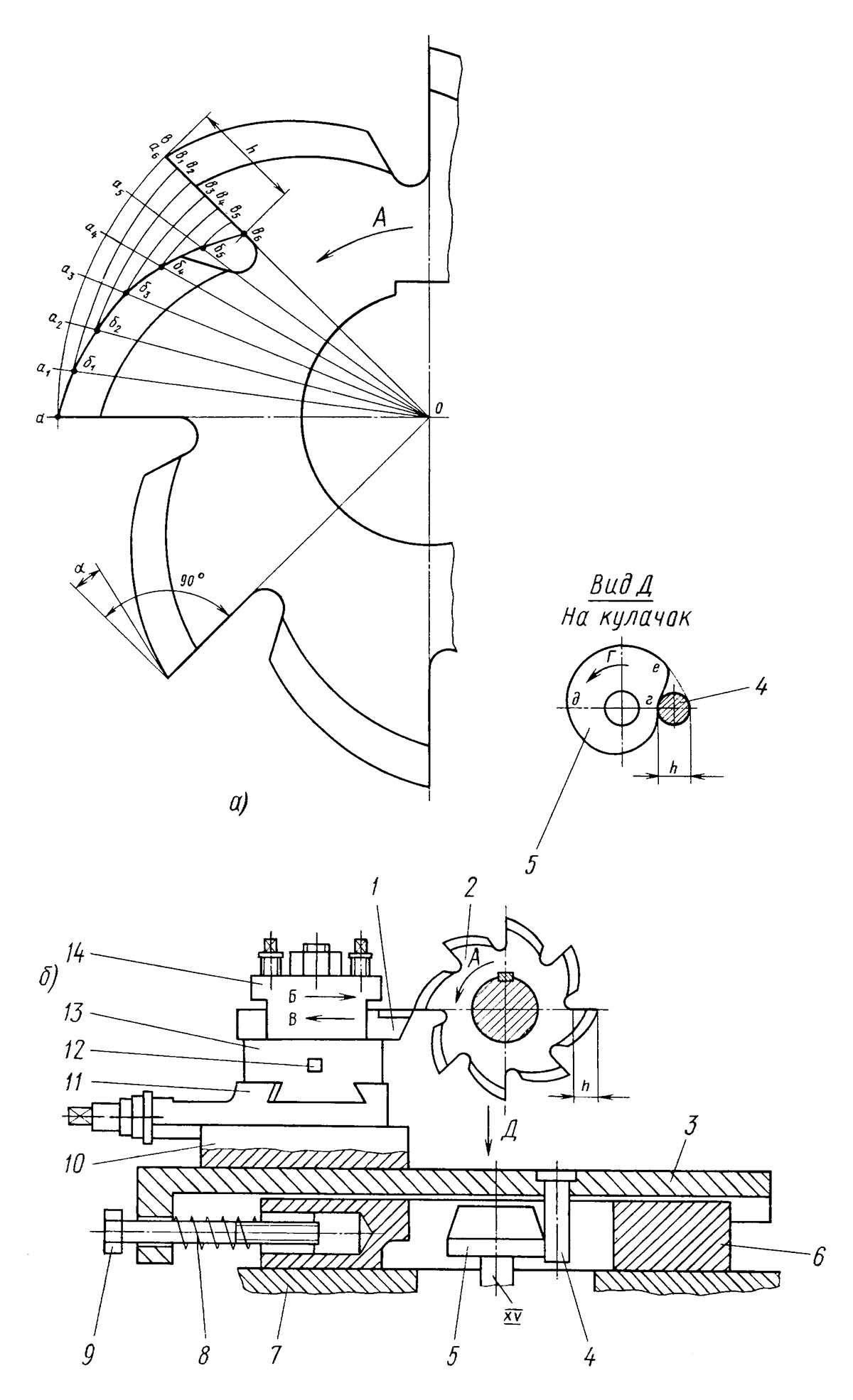 Потиличні рухи супорта створюються обертовим у напрямку стрілки Г кулачком 5 з профілем г, д, е, виконаним по спіралі Архімеда з висотою підйому h. Палець 4, закріплений на санках 3, ковзає по профілю кулачка і переміщає в напрямку стрілки Б санки 3 і суппорт з різцем 1, при цьому відбувається затилування зуба фрези 2 за профілем а-б5 (див. рис. 4, а), санки 3 (див. рис. 4, б) і суппорт після закінчення обробки зуба під дією пружини 8 переміщуються в напрямку стрілки, різець 1 відводиться назад.