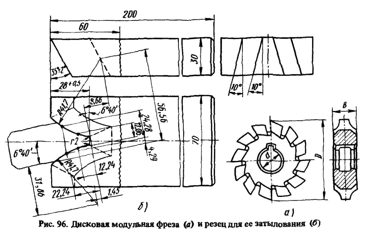 Дискові зуборізні (модульні) фрези, показані на рис 96. призначені для виготовлення зубчастих коліс з m = 1..16 мм. Залежно від модуля діаметр фрези D змінюється від 50 до 180 мм, а число зубів від 14 до 10. Ширина фрези b і посадковий діаметр d також змінюються залежно від модуля. Модульні фрези затилують декількома фасонними різцями, з яких одні використовують для обдирання, а інші для зачистки. Точність профілю, що затилюється, перевіряють за шаблоном на просвіт. Розмір просвіту за ГОСТ 10996-64 дільниці евольвенти зуба має перевищувати 0,05..0,08 мм залежно від модуля фрези.