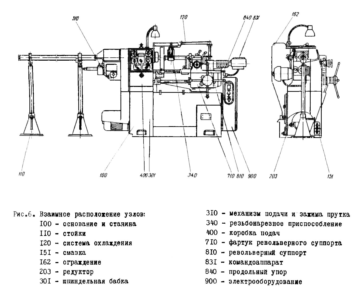 Розташування основних частинин револьверного верстата 1Г325. Завантажити у збільшеному масштабі