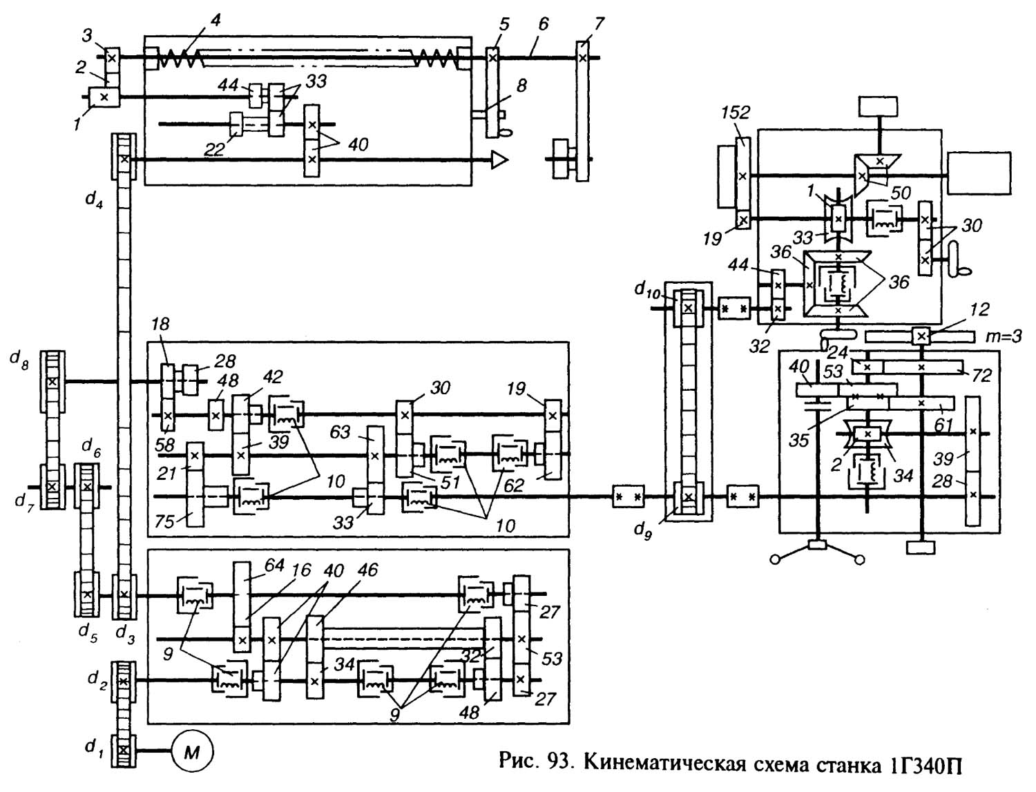 1. Схема кінематична токарно-револьверного верстата 1Г340П, 1Г340. Дивитись у збільшеному масштабі
