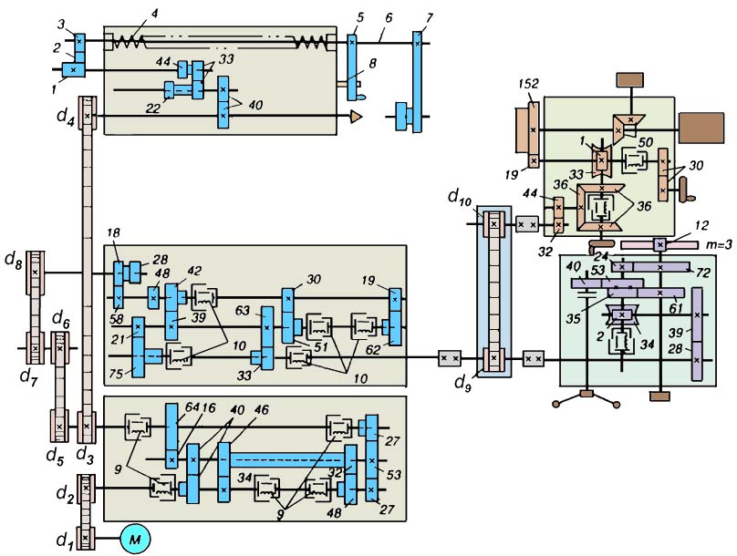 За допомогою електромагнітних муфт і блоку шестерень 1 виходить 12 поздовжніх і поперечних подач револьверного супорта у двох діапазонах.