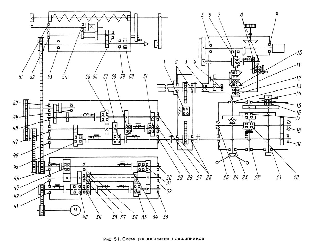 Рухи у верстаті . Головний рух - обертання шпинделя (рис. 93) здійснюється від електродвигуна М (N=6,0/6,2 кВт; n=960/1440 хв -1 ) через коробку швидкостей. На верстаті застосовано уніфіковану автоматичну коробку швидкостей типу АКС 206—32—21 (рис. 93). У коробці швидкостей із чотирма валами є п'ять електромагнітних муфт 9 (ЕТМ-114) і п'ять електромагнітних муфт 10 (ЕМ-104), які, включаючись попарно, дають на вихідному валу 12 ступенів частоти обертання (з урахуванням двошвидкісного електродвигуна). Частоти обертання можна перемикати на ходу та під навантаженням. Гальмування вихідного валу коробки швидкостей здійснюється одночасно включенням муфт на цьому валу при відключених інших муфтах. Реверсування шпинделя здійснюється електродвигуном.