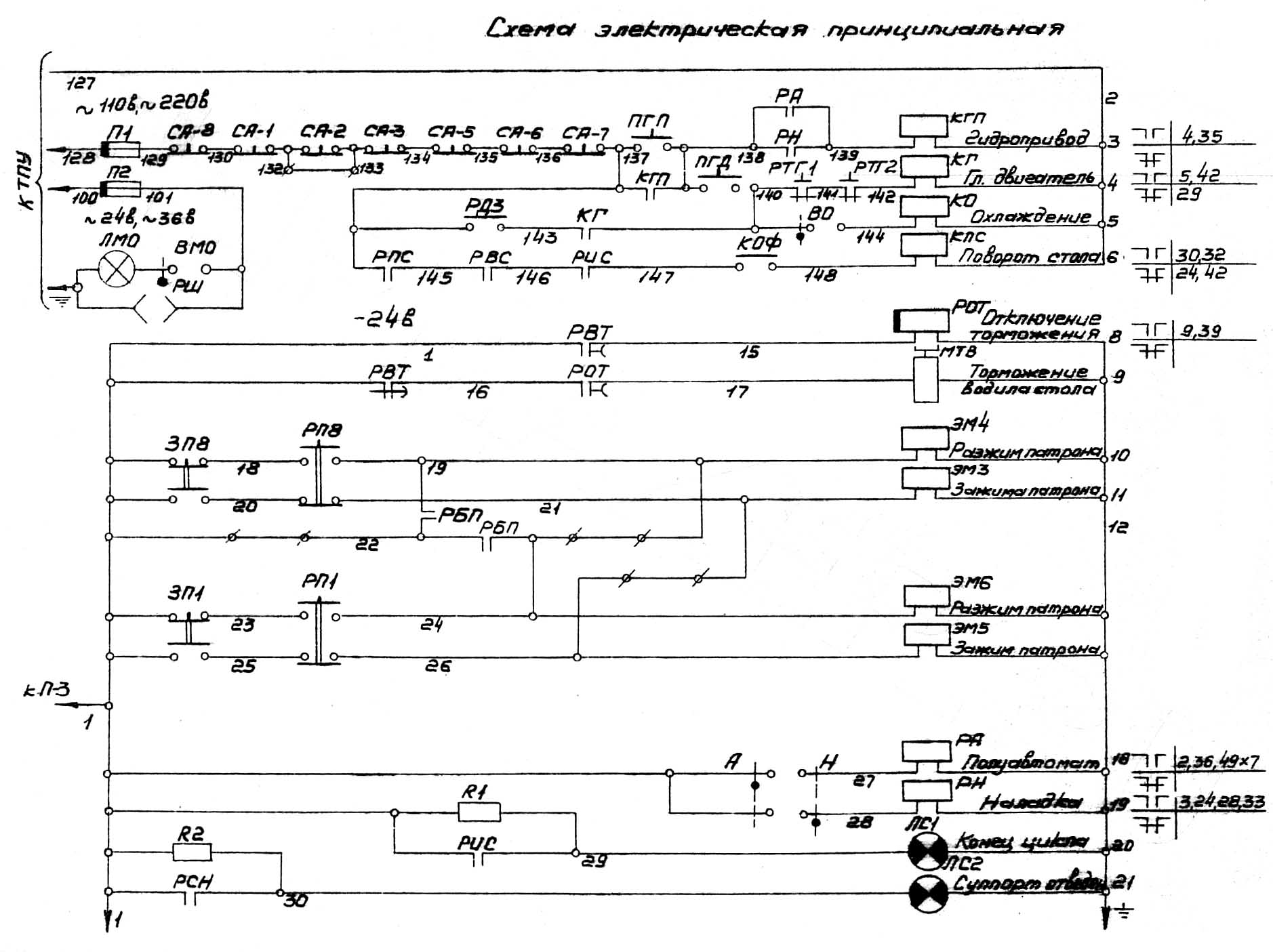 Так як час знімання, встановлення та затискання деталі в патроні завантажувальної позиції, як правило, менше часу циклу, схема передбачає можливість подачі команди "Пуск циклу" раніше, ніж закінчиться обробка на робочих позиціях. У цьому випадку натисканням на кнопку ПЦ включається реле повороту столу РПС, що переходить на саможивлення і ланцюга 137-145 готує ланцюг повороту столу.