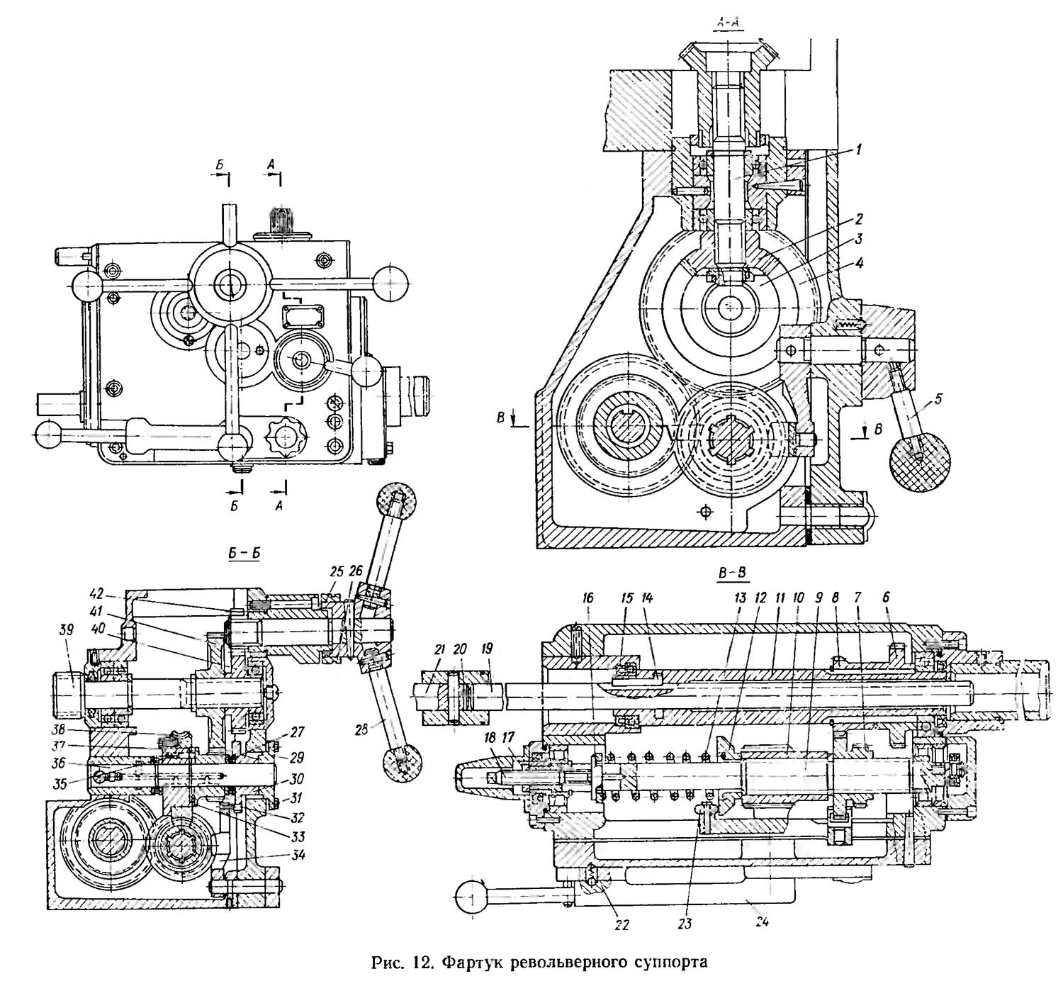 Перемещается револьверний супорт вручную штурвалом 28 через шестерни 42 і 40 при выключенной полумуфте 33. На ступице штурвала имеется лимб 26, который стопорится пружиной 25. Сальники 15 предотвращают вытекание масла по ходовому валу.