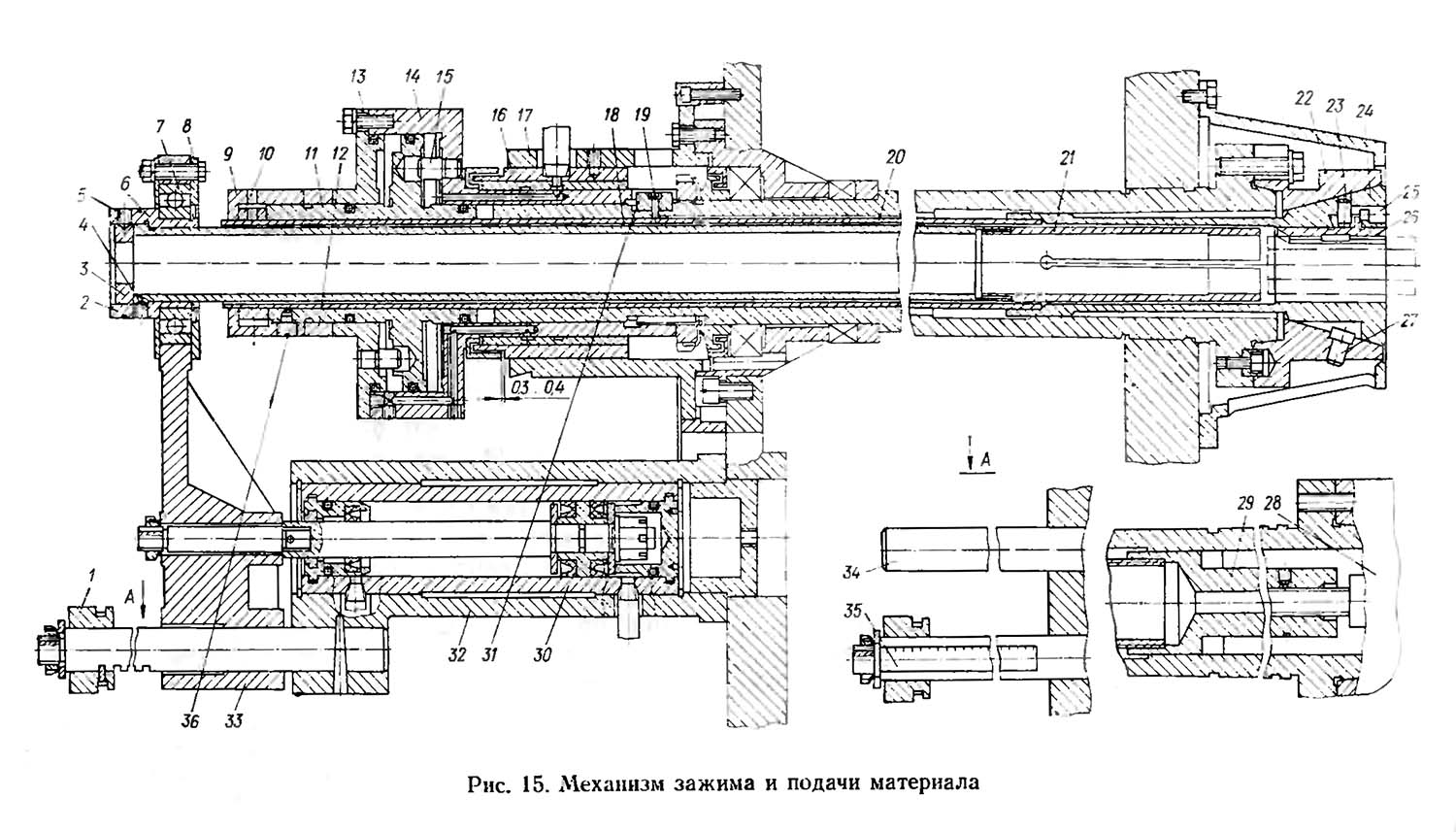 Механізм зажиму і подачі материала показан на рис. 15. Корпус цангового патрона 22 закреплен на переднем фланце шпинделя. Затискна подвижная цанга 24 связана з корпусом поводковыми штифтами 27. В расточке нерухомою цанги крепят сменные вкладыши 26, которые зажимают гвинтами 25 і удерживают от проворота штифтами 23. Такая конструкция механізма зажиму обеспечивает высокую стабильность положения (в пределах 0,1 мм) торца зажатого прутка. Затискна цанга навинчена на трубу 20 зажима.