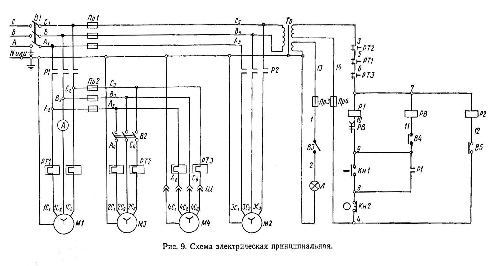 Пуск головного електродвигуна Ml осуществляется нажатием кнопки кнопочной станції «1» (8-9), которая замыкает ланцюг катушки контактора Р1 (7-10), переводя его на самопитание.