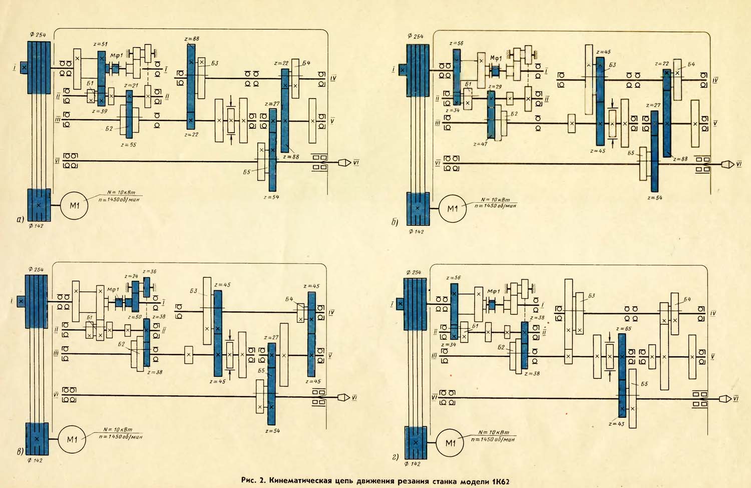 Коробка подач получает вращение от вала VIII через гітару со сменными блоками шестерен С1 і С2. Для нарізання метрических і дюймовых різьб і получения механической подачі сменные блоки С1 і С2 устанавливаются, как показано на схеме, і вращение коробке подач сообщается через шестерни 42—95—50. При необходимости нарізання модульных різьб сменные блоки шестерен переворачиваются, і вращение коробке подач передається шестернями 64—95—97. Для нарізання торцовых різьб устанавливаются сменные колеса 46—108—58, которые поставляются по особому заказу.