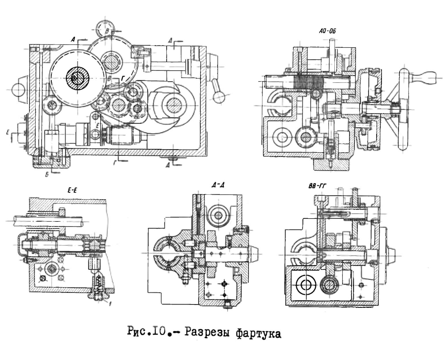 Фартук снабжен кулачковой предохранительной муфтой, которая предохраняет механізм подачі от перегрузки. Муфту регулируют отдельно для поперечных і продольных подач винтом I /рис.10/.