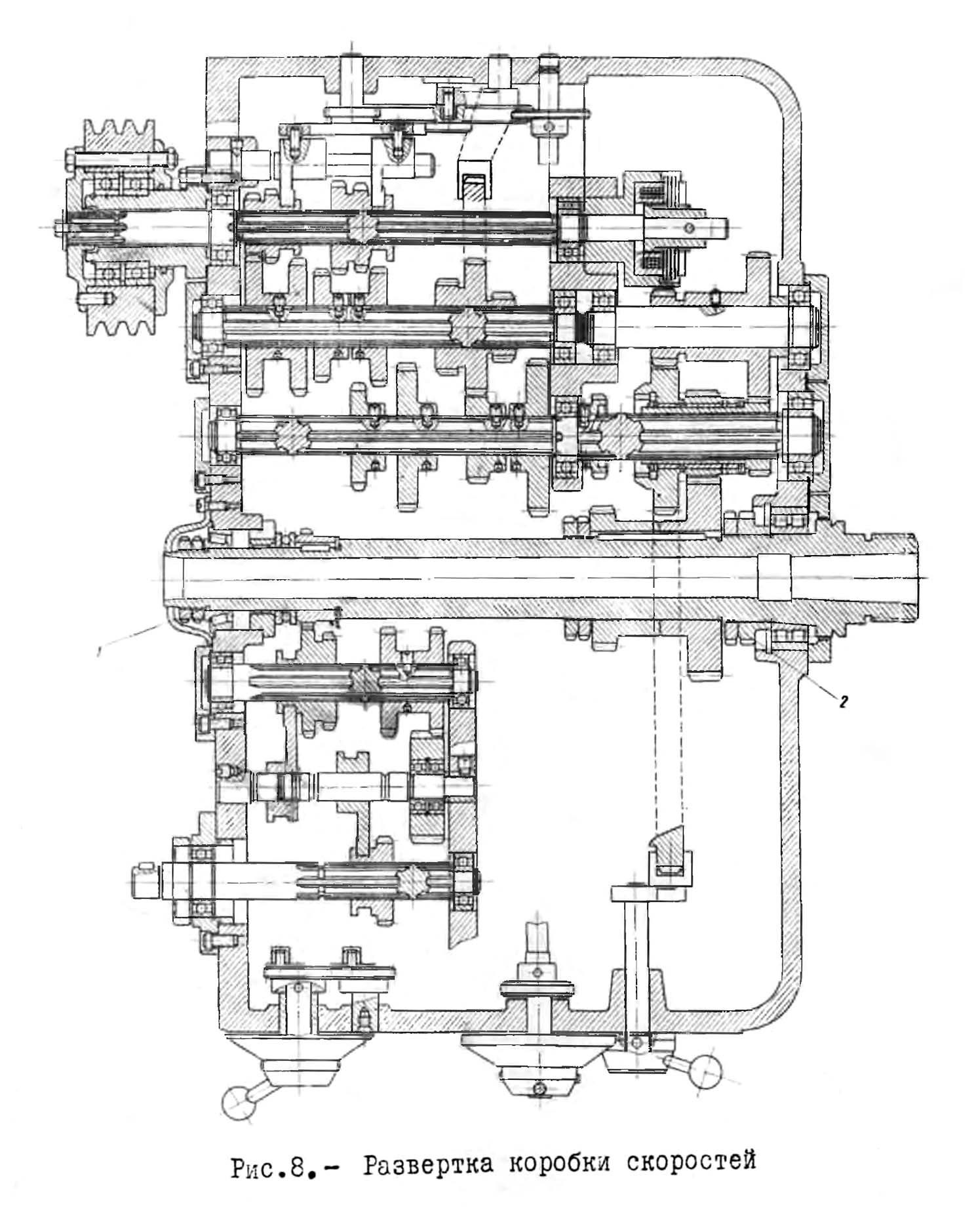 Механізм коробки швидкостей (рис.8) заключен в чугунный корпус, который устанавливается в левой частини станины і крепится к ней болтами. Коробка швидкостей передает 24 различных скорости в Диапазоне 10..1250 /1Л6I/ і 16..2000 /1Л61/. Шпиндель получает рух от електродвигуна типа АЛ42/4 мощностью 2,8 кВт /1Л61/ і A5I/4 мощностью 4,5 кВт /1Л61/, /см.рис.6/.