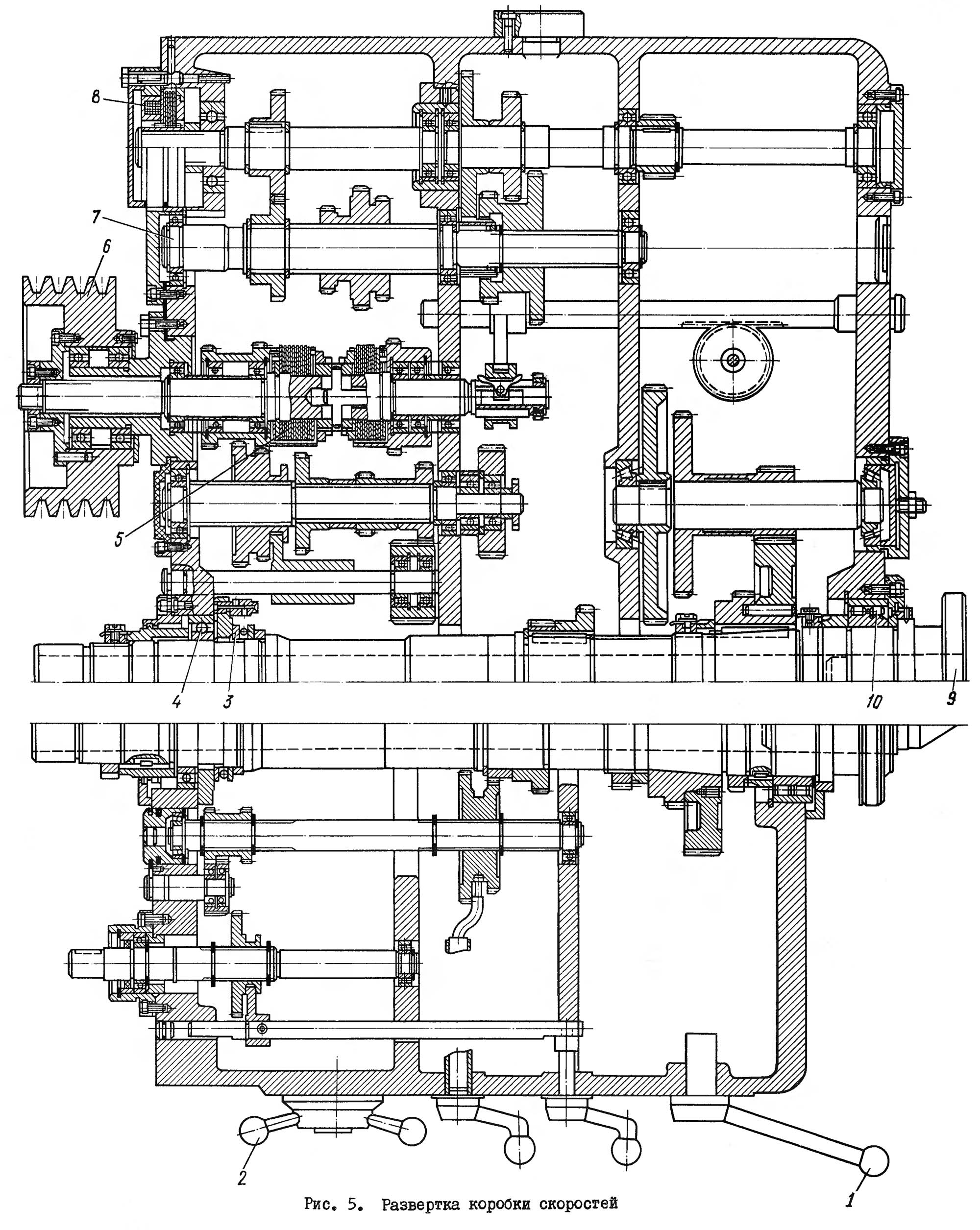 Коробка швидкостей крепится к левой головной частини станины. Приводной шкив 6 (рис. 5) коробки швидкостей получает рух от електродвигуна через клиноременную передачу.