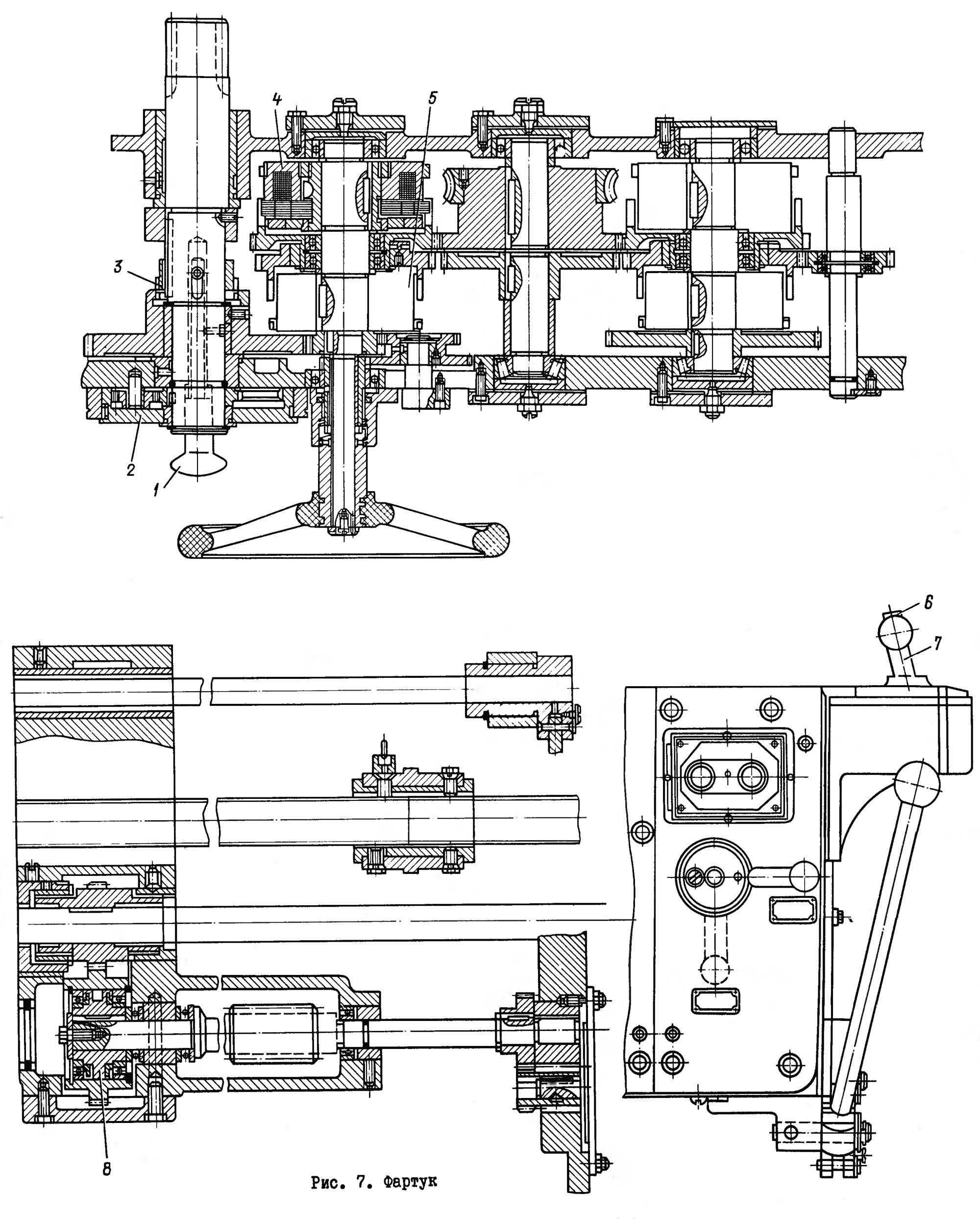 Благодаря наличию електромагнітних муфт 4 і 5 керування фартуком сосредоточено в одной поворотной рукоятке 7, расположенной з правой стороны фартука. Направление поворота етой рукоятки совпадает з направлением необходимого руху подач или швидкого переміщення каретки і поперечных салазок. При етом для обеспечения швидкого переміщення надо нажать на кнопку 6, находящуюся на самой рукоятке.