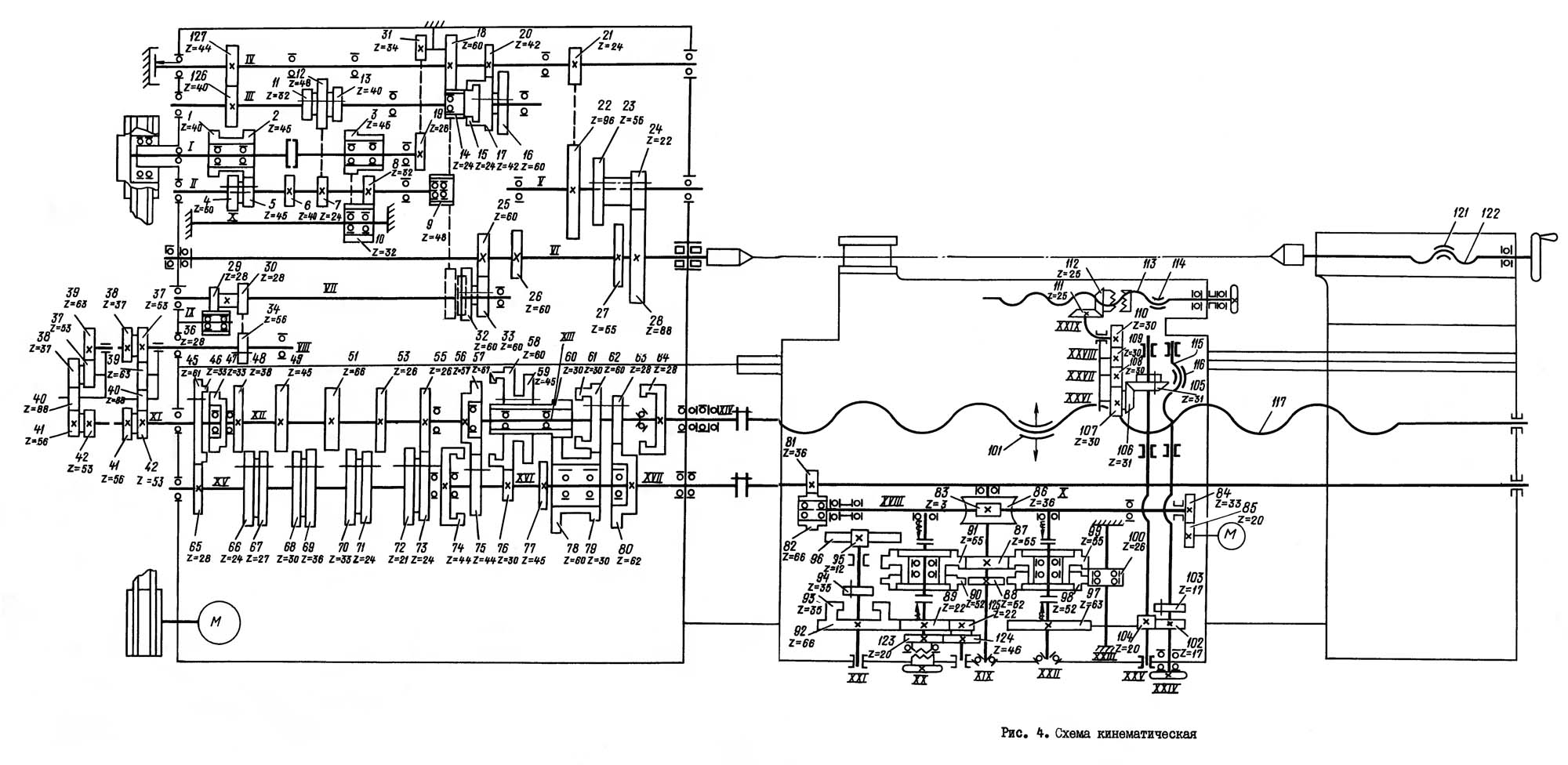 Рух передається через сменные зубчасті колеса 37-39-40-42 на вал XI коробки подач, далее через зубчасті колеса 45-65, (66, 67, 68, 69, 70, 71, 72, 73) - (48, 49, 51, 53, 55), 56-75, (76, 77) - (58, 59), 60-78, 79, 62, муфту 63-64 на винт 117.