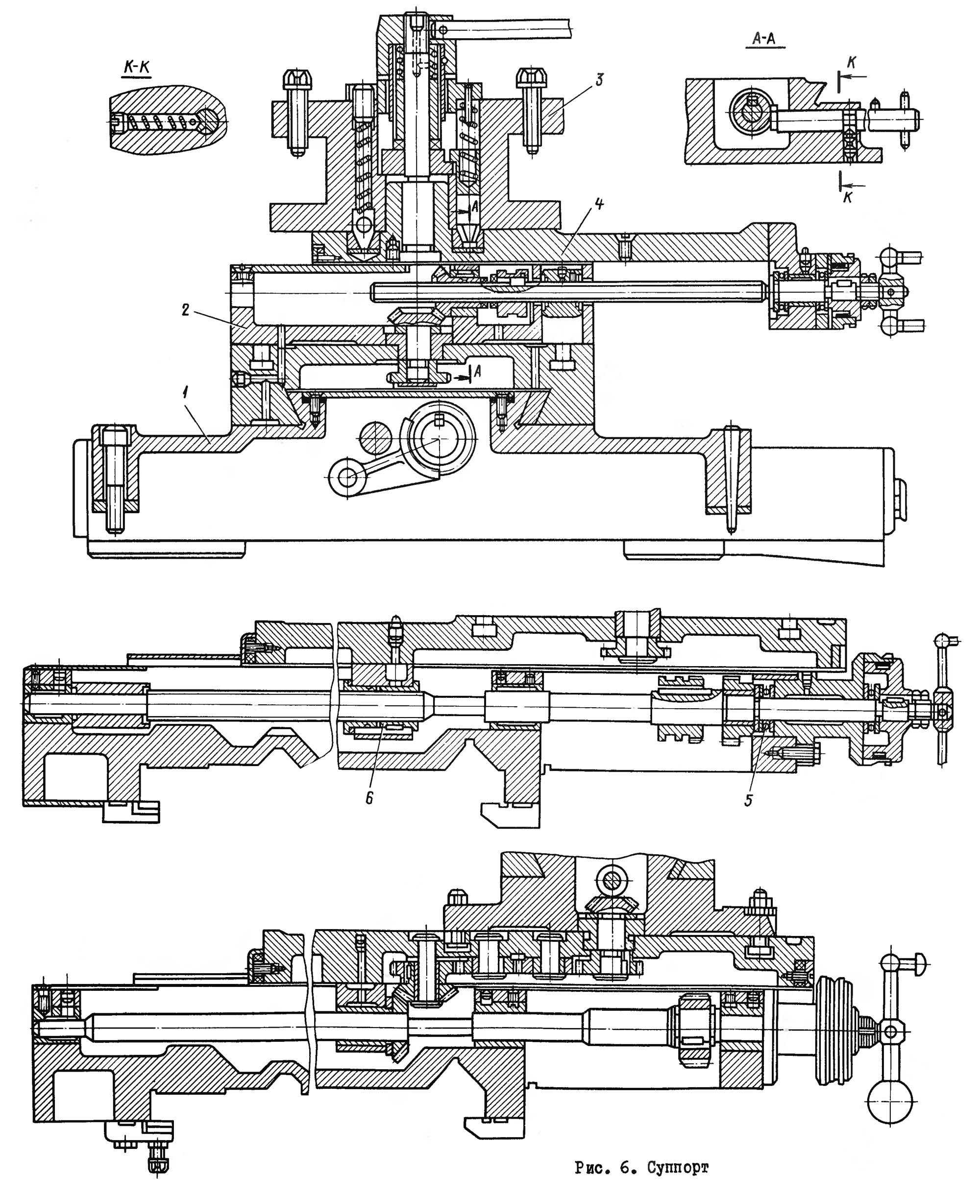 Суппорт крестовой конструкції имеет продольное перемещение по направляющим станины і поперечное - по направляющим каретки I (рис. 6). Оба переміщення могут быть ручными или механическими, а механическое - рабочим или ускоренным. Поворотная часть суппорта 2 имеет направляющие для переміщення верхней частини суппорта 4 з резцовой головкой 3.