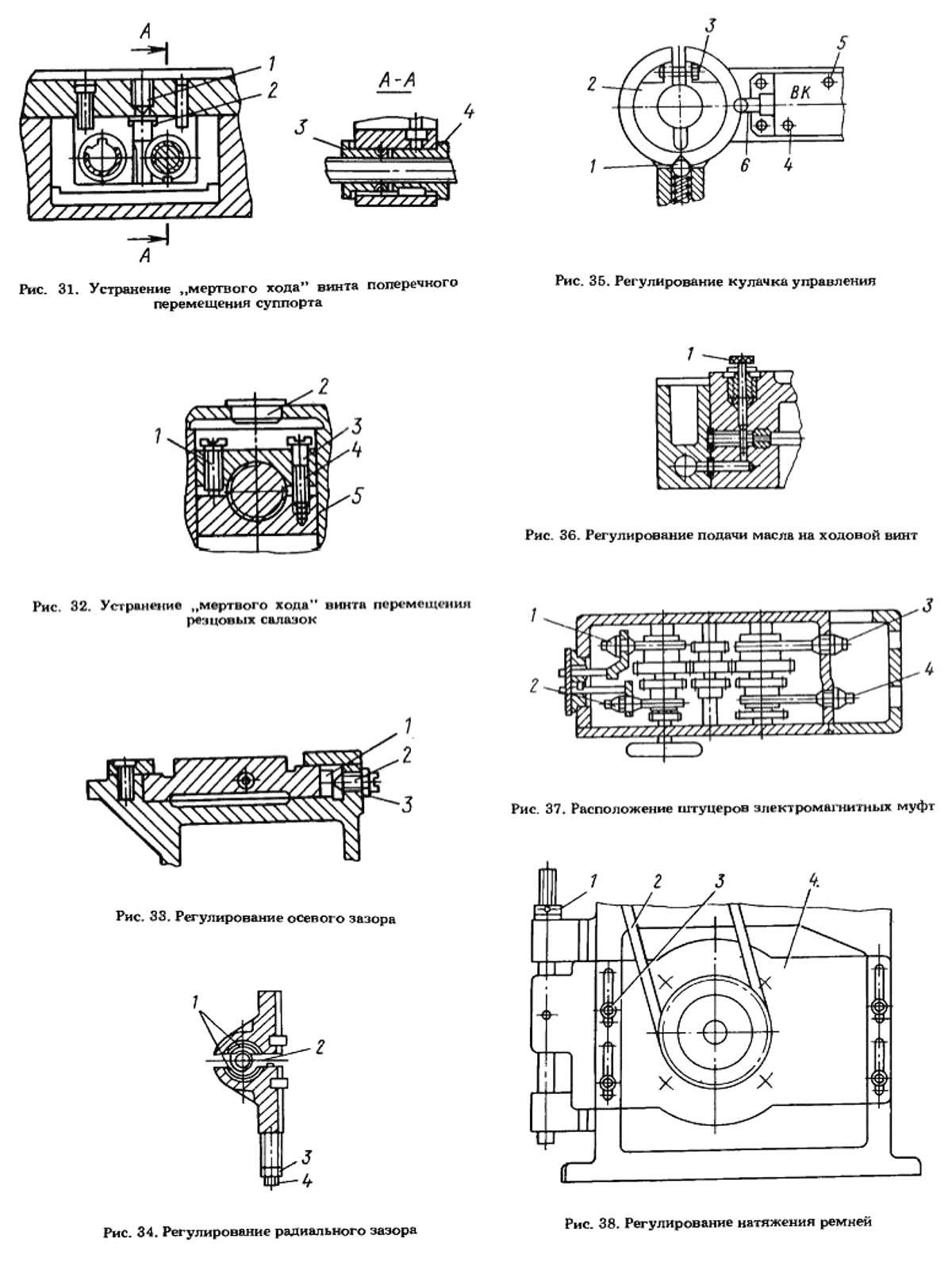 Величина радиального зазору между ходовым винтом 2 і вкладышами его гайки 1 регулируется ввинчиванием или вывинчиванием гвинта 4, расположенного под фартуком. В отрегулированном положении винт 4 фиксируется гайкой 3.