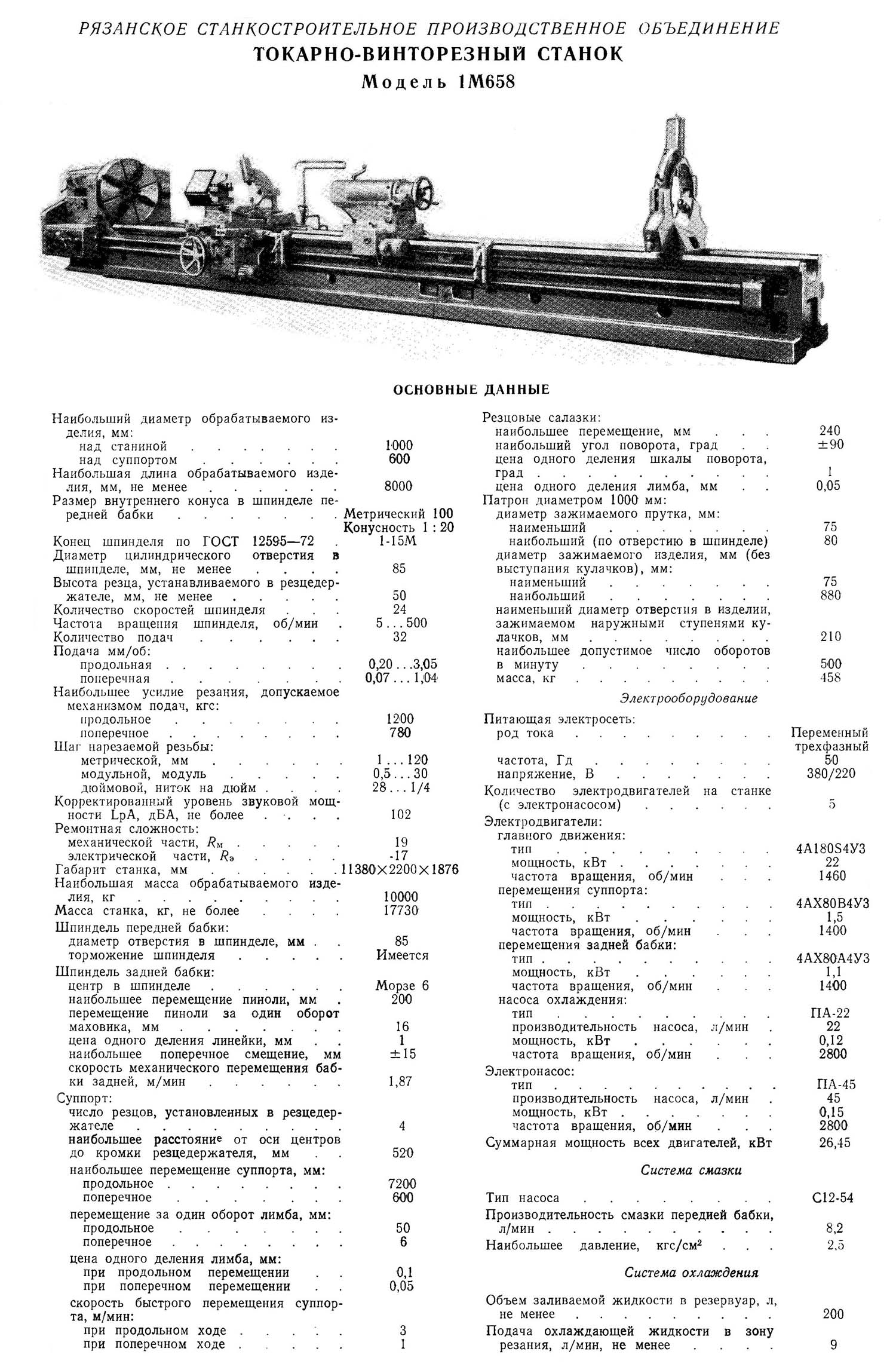 Токарно-гвинторізний верстат 1М658 призначений для обробки деталей середніх та великих розмірів, в умовах одиничного та дрібносерійного виробництва. На верстаті можна виробляти зовнішнє і внутрішнє точення, включаючи точення конусів, розточування, свердління та нарізування різьблень - метричної, модульної, дюймової та питної).