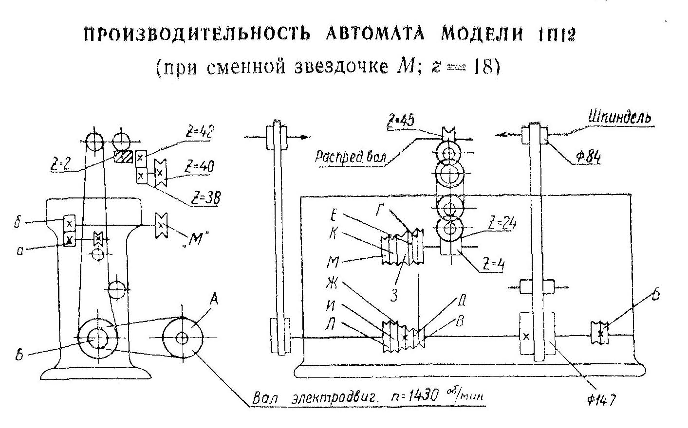 Змінні (А та Б) та ступінчасті шківи та змінні зубчасті колеса а та б дають можливість мати на розподільчому валу 400 сходинок від 0,154 до 33,8 об/хв.