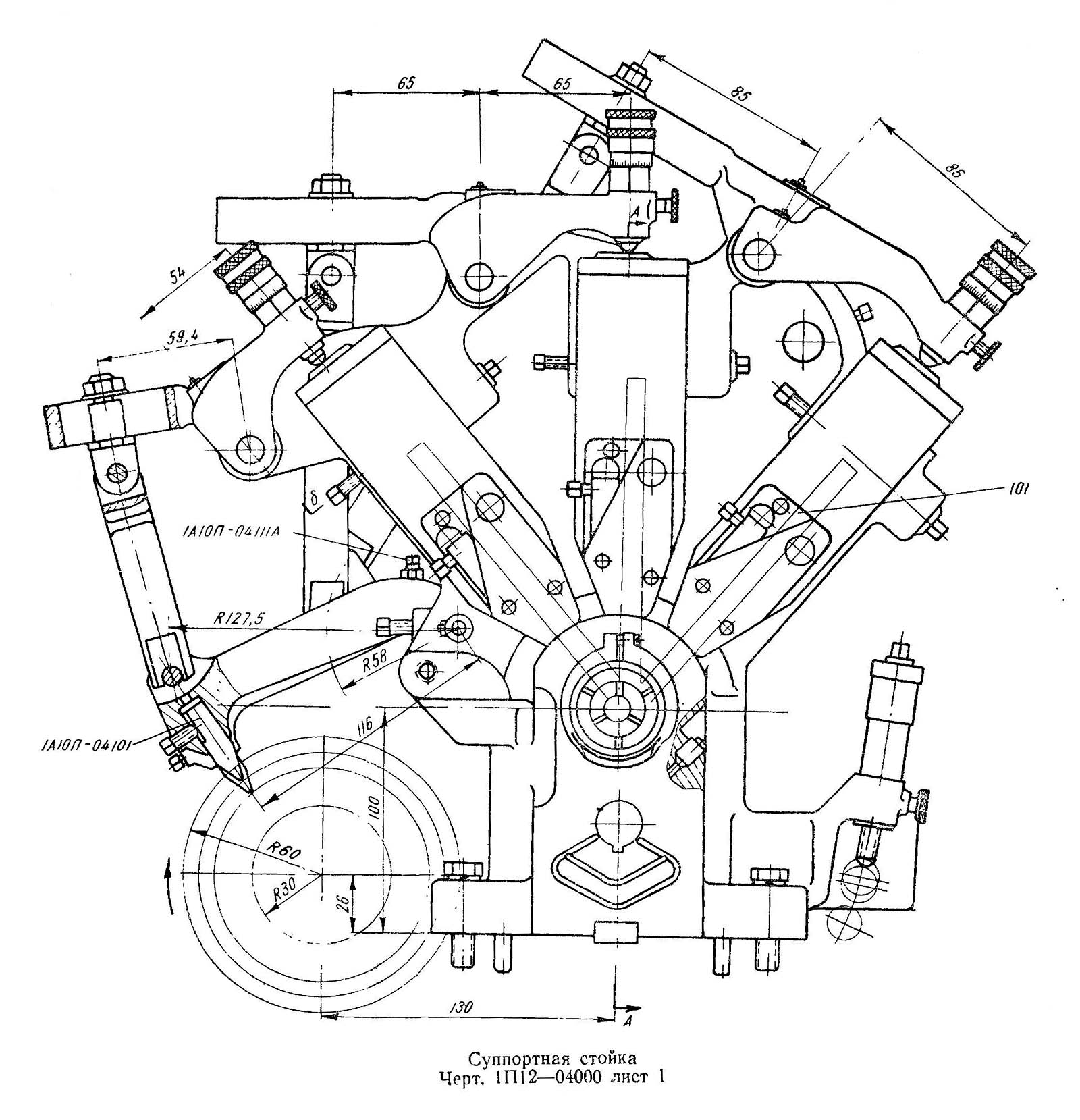 Всі механізми супортної стійки (схема 1П12-04000 лист 1 і 2) монтуються в корпусі 011А, що представляє собою фасонний чавунний виливок. На передній стінці корпусу розміщені три супорти 015, на санках яких змонтовані повзуни 016 з різцетримачами 101 і різцями. На дзеркалі супортної стійки змонтовано па конічної осі 109А балансир 011А (креслення 1П12-05000) з двома різцями. У центрі супортної стійки, по осі головного шпинделя в конусній розточці вміщено склянку люнета.
