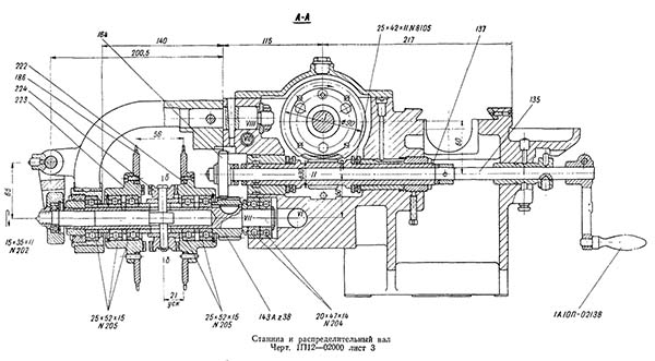 З тильного боку станини кріпиться механізм прискореного ходу розподільчого валу, що складається з важеля для перемикання зубчастої муфти 222, 223 і двох зірочок 224, що вільно сидять на осі.